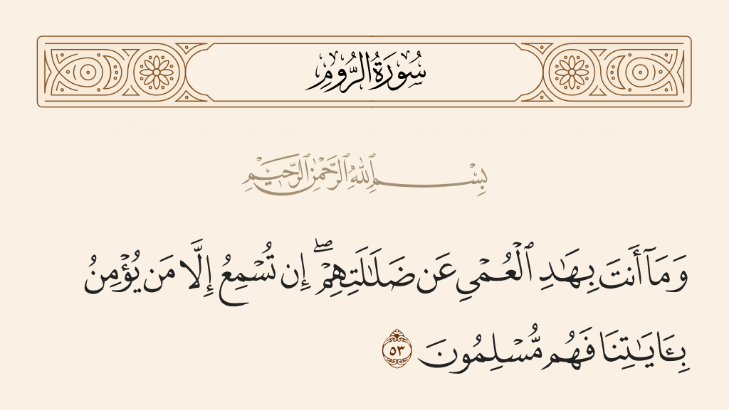 قال تعالى: «وَمَا أَنْتَ بِهَادِ الْعُمْيِ عَنْ ضَلَالَتِهِمْ إِنْ تُسْمِعُ إِلَّا مَنْ يُؤْمِنُ بِآيَاتِنَا فَهُمْ مُسْلِمُونَ».