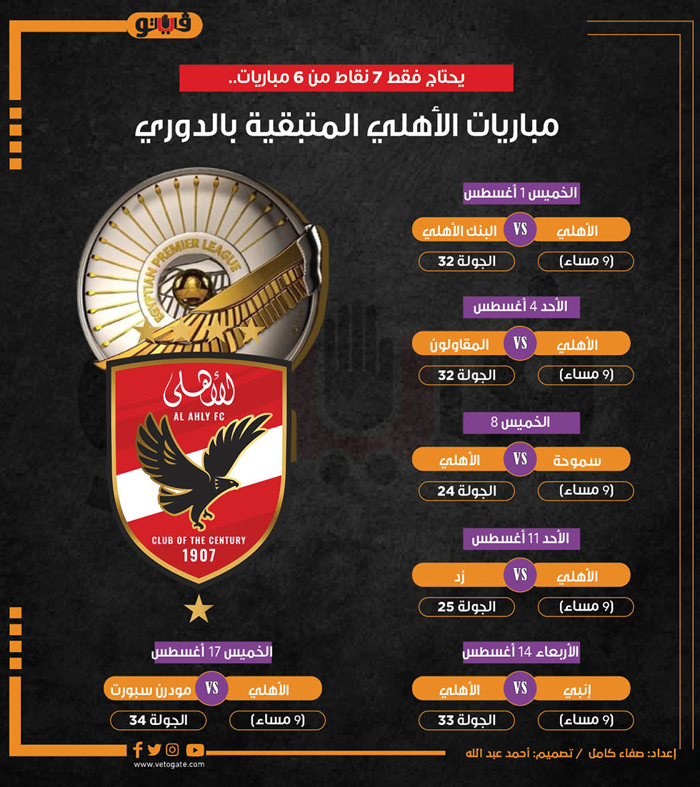 يحتاج فقط 7 نقاط من 6 مباريات.. مباريات الأهلي المتبقية بالدوري (إنفوجراف) الأربعاء 31/يوليو/2024 - 11:04 م 7/31/2024 11:04:11 PM الأهلي، فيتو سامية شكري شارك طباعة 18 حجم الخط شارك طباعة الأهلي الاهلي ضد المقاولون الاهلي ضد زد الاهلي ضد المقاولون العرب