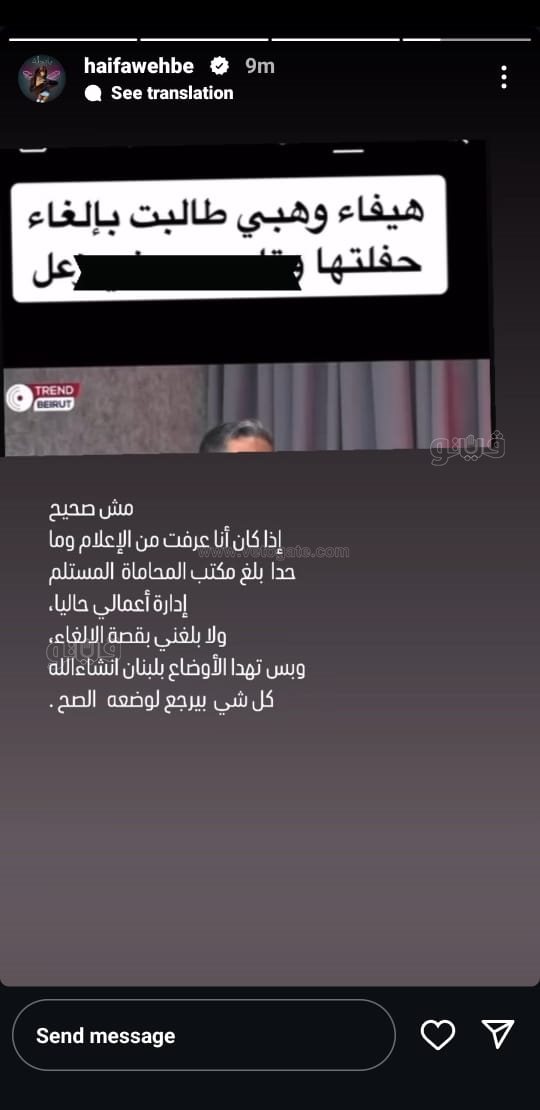فشاركت هيفاء صورة لأحد المواقع الاخبارية التي تؤكد طلبها بالغاء حفلتها في لبنان عقب الهجوم الذي استهدف العاصمة اللبنانية بيروت مساء أمس الثلاثاء، وكتبت المغنية: “مش صحيح، إذغ كان أنا عرفت من الإعلام وما حد بلغ مكتب المحاماة المستلم إدارة أعمالي حاليًا، ولا بلغني بقصة الإلغاء".