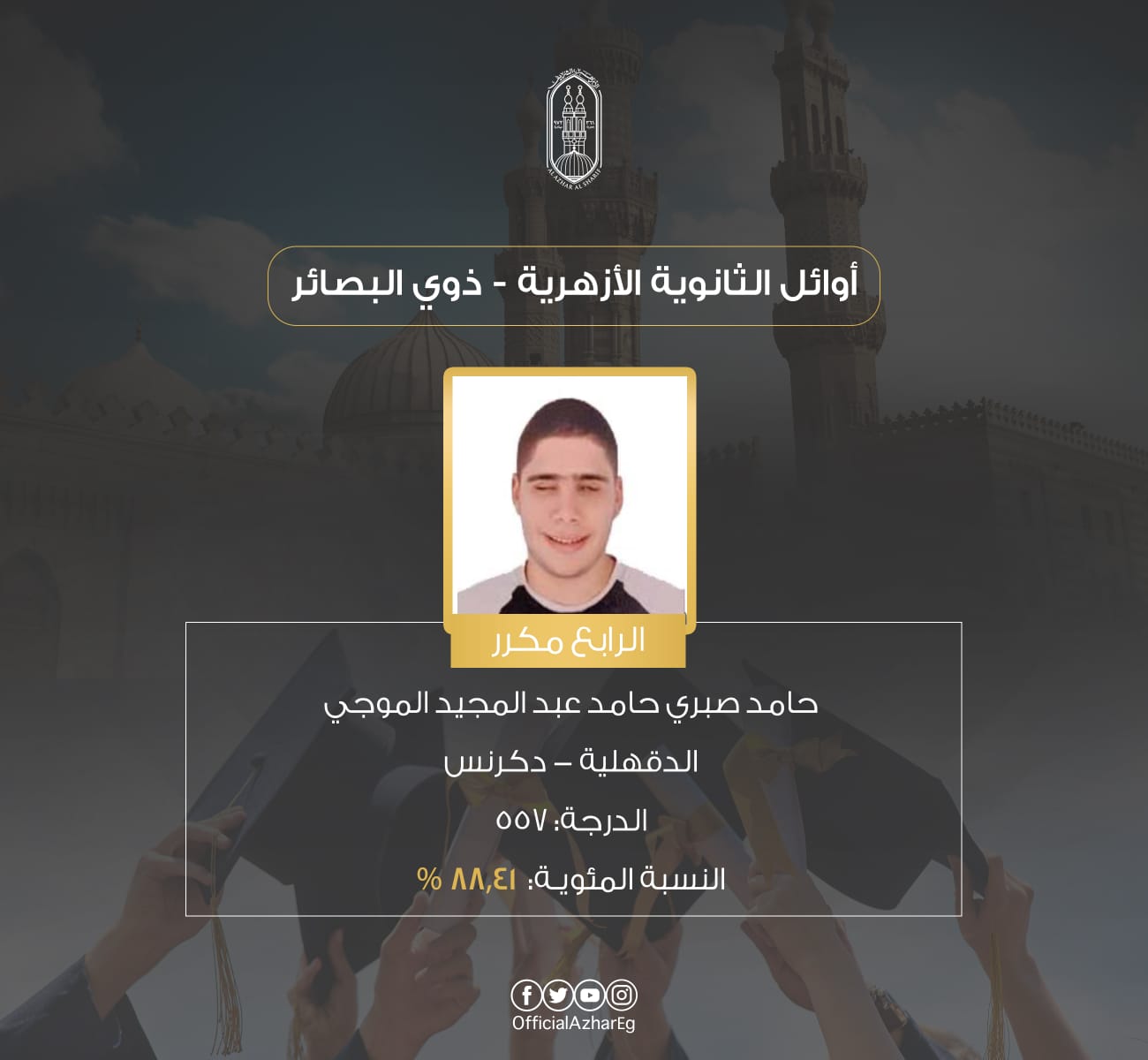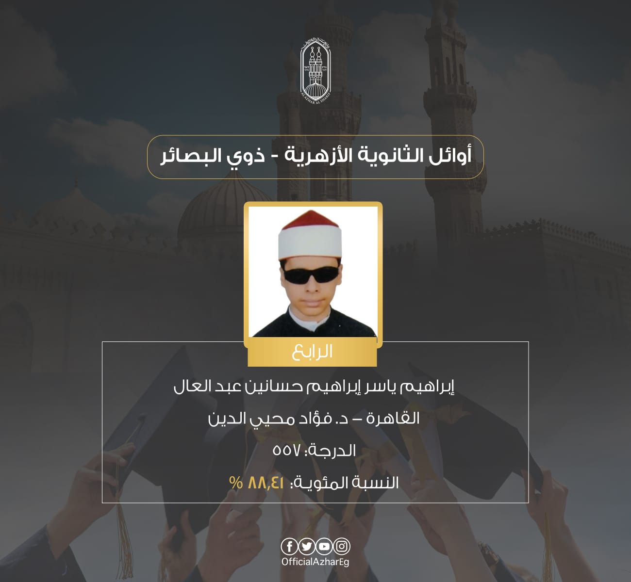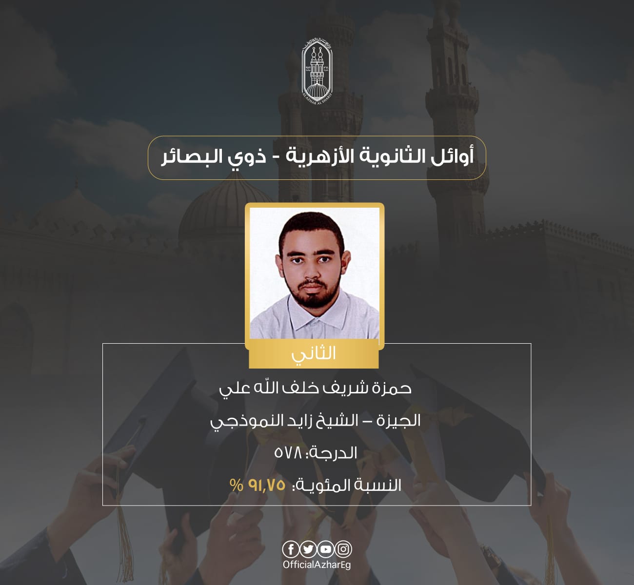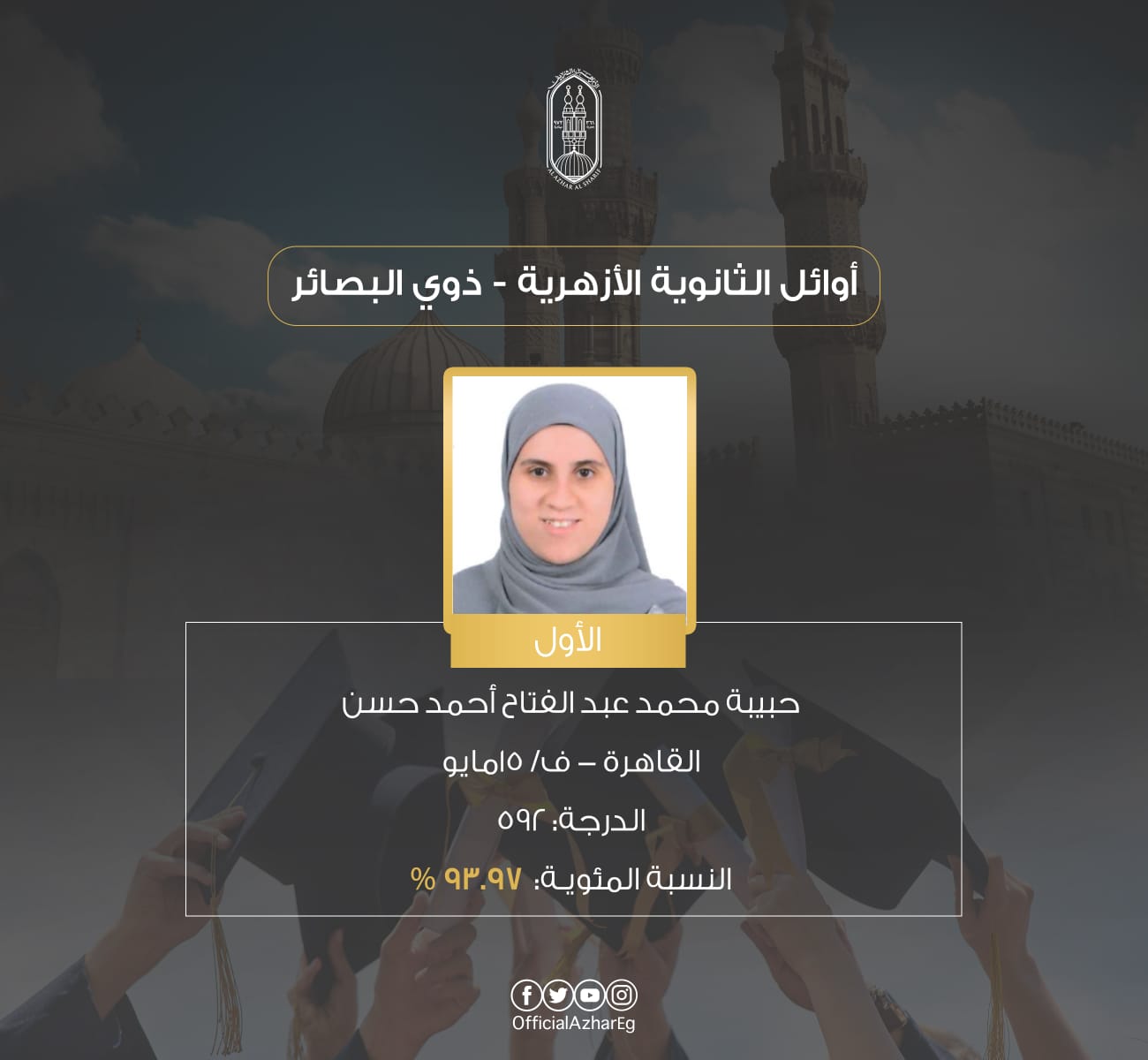 وجاءت في المركز الأول على الثانوية الأزهرية مكفوفين الطالبة حبيبة محمد عبد الفتاح أحمد، من معهد فتيات 15 مايو بالقاهرة بمجموع 592 بنسبة (93.97%)، وفي المركز الثاني الطالب حمزة شريف خلف الله علي، من معهد الشيخ زايد النموذجي بالجيزة، بمجموع 578 بنسبة (91.75%)