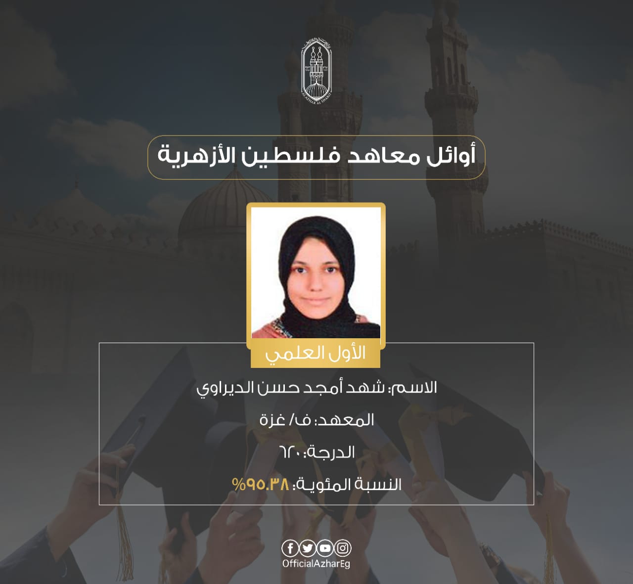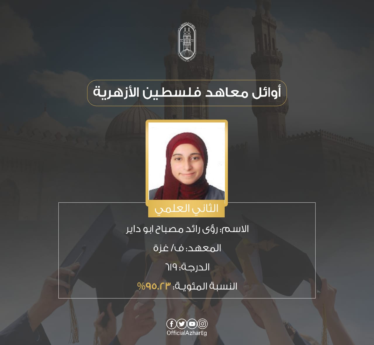 أكدت الطالبة رؤى رائد بالقسم العلمي في الثانوية الأزهرية بمعاهد غزة، فرحتها بعد حصولها على المركز الثاني بالقسم العلمي ضمن أوائل غزة بالثانوية الأزهرية.