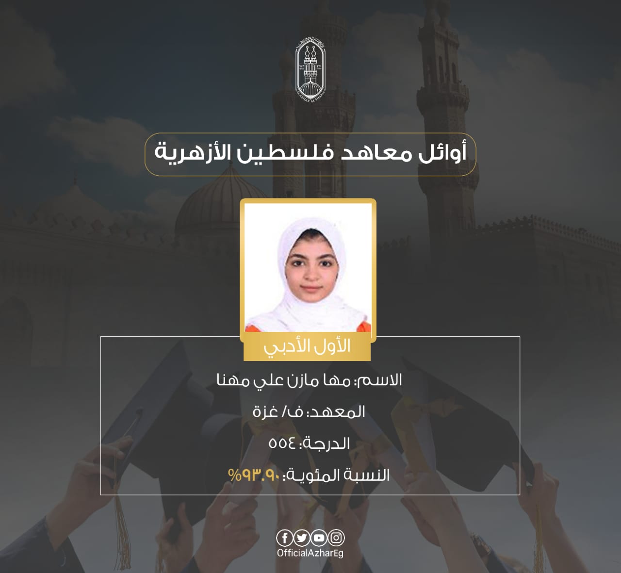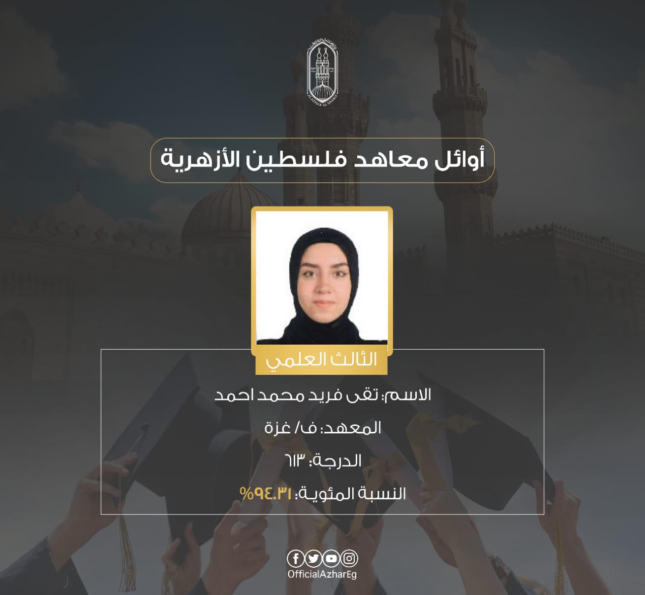 بينما جاءت في المركز الثالث الطالبة تقى فريد محمد، من معهد فتيات غزة بمجموع 613 بنسبة 94.31%، وفي المركز الرابع جاءت الطالبة وفا عبدالله محمد، من معهد فتيات غزة، بمجموع 611 بنسبة 94%، وجاءت الطالبة مها مازن علي مهنا، من معهد فتيات غزة في المركز الأول على القسم الأدبي بمجموع 554 ونسبة (93.90%).