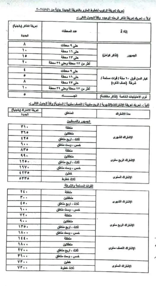 وفيما يلي تفاصيل الأسعار الجديدة للاشتراكات الشهرية والربع سنوية والسنوية للمترو بعد الزيادة: