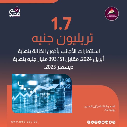 سلط مركز المعلومات بمجلس الوزراء الضوء على ارتفاع استثمارات الأجانب بأذون الخزانة إلى 1.697 تريليون جنيه بنهاية أبريل 2024، مقابل 393.151 مليار جنيه بنهاية ديسمبر 2023.