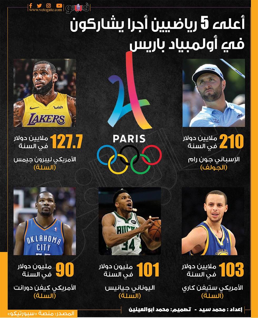 أعلى 5 رياضيين أجرا يشاركون في أولمبياد باريس (إنفوجراف) السبت 03/أغسطس/2024 - 11:35 ص 8/3/2024 11:35:21 AM ليبرون جيمس، فيتو محمد سيد شارك طباعة 18 حجم الخط شارك طباعة اولمبياد باريس جون رام ليبرون جيمس ستيفن كاري كيفن دورانت جيانيس أنتيتوكونمبو