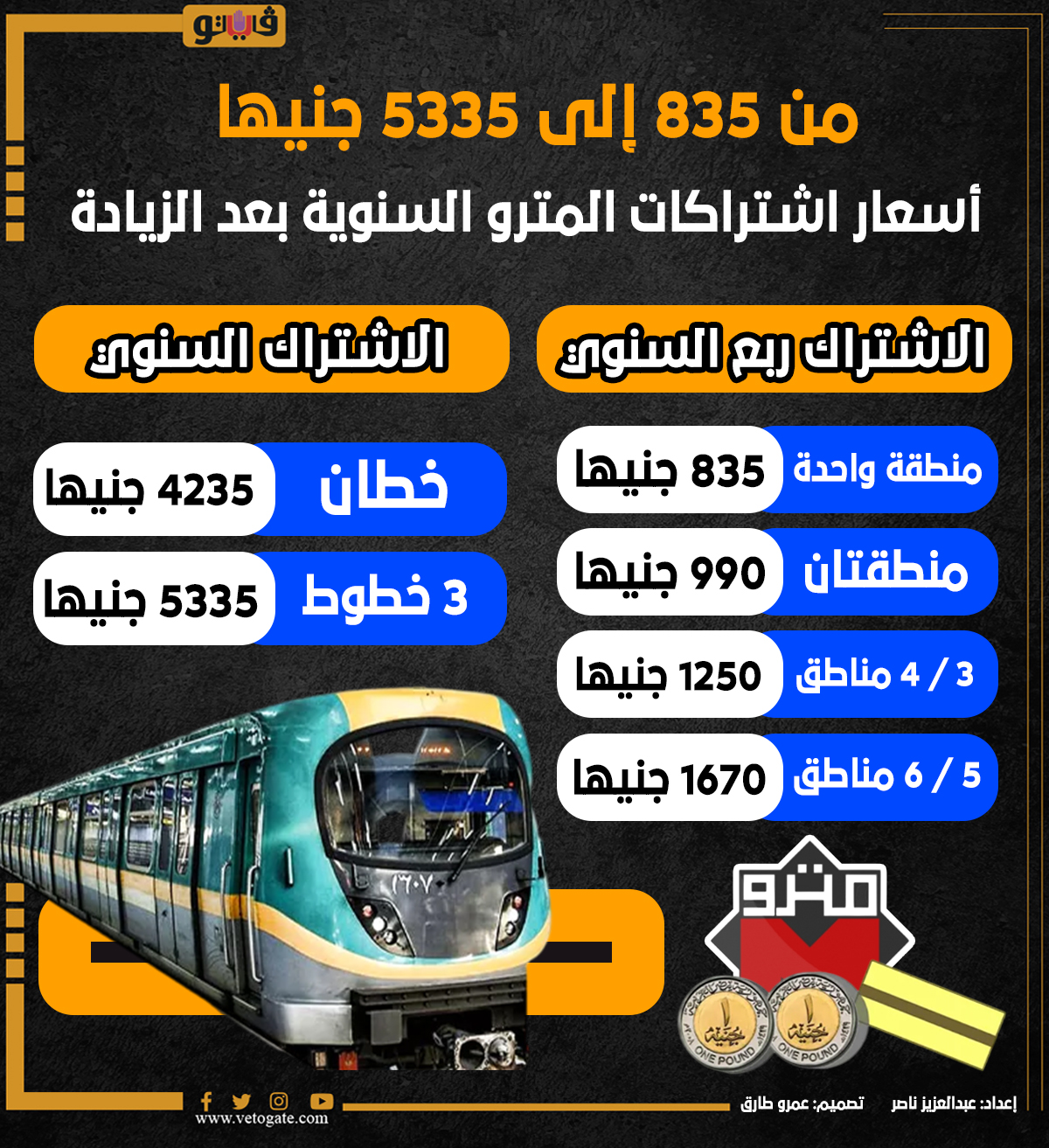 من 835 إلى 5335 جنيها.. أسعار اشتراكات المترو السنوية بعد الزيادة (إنفوجراف) الجمعة 02/أغسطس/2024 - 03:06 ص 8/2/2024 3:06:51 AM مترو الأنفاق، فيتو عبدالعزيز ناصر تصميم :عمرو طارق شارك طباعة 18 حجم الخط شارك طباعة أسعار اشتراكات المترو أسعار اشتراكات المترو 2023 زيادة أسعار اشتراكات المترو مترو الأنفاق زيادة اسعار تذاكر المترو تذاكر مترو الأنفاق أسعار تذاكر المترو 2024 اشتراك المترو السنوي