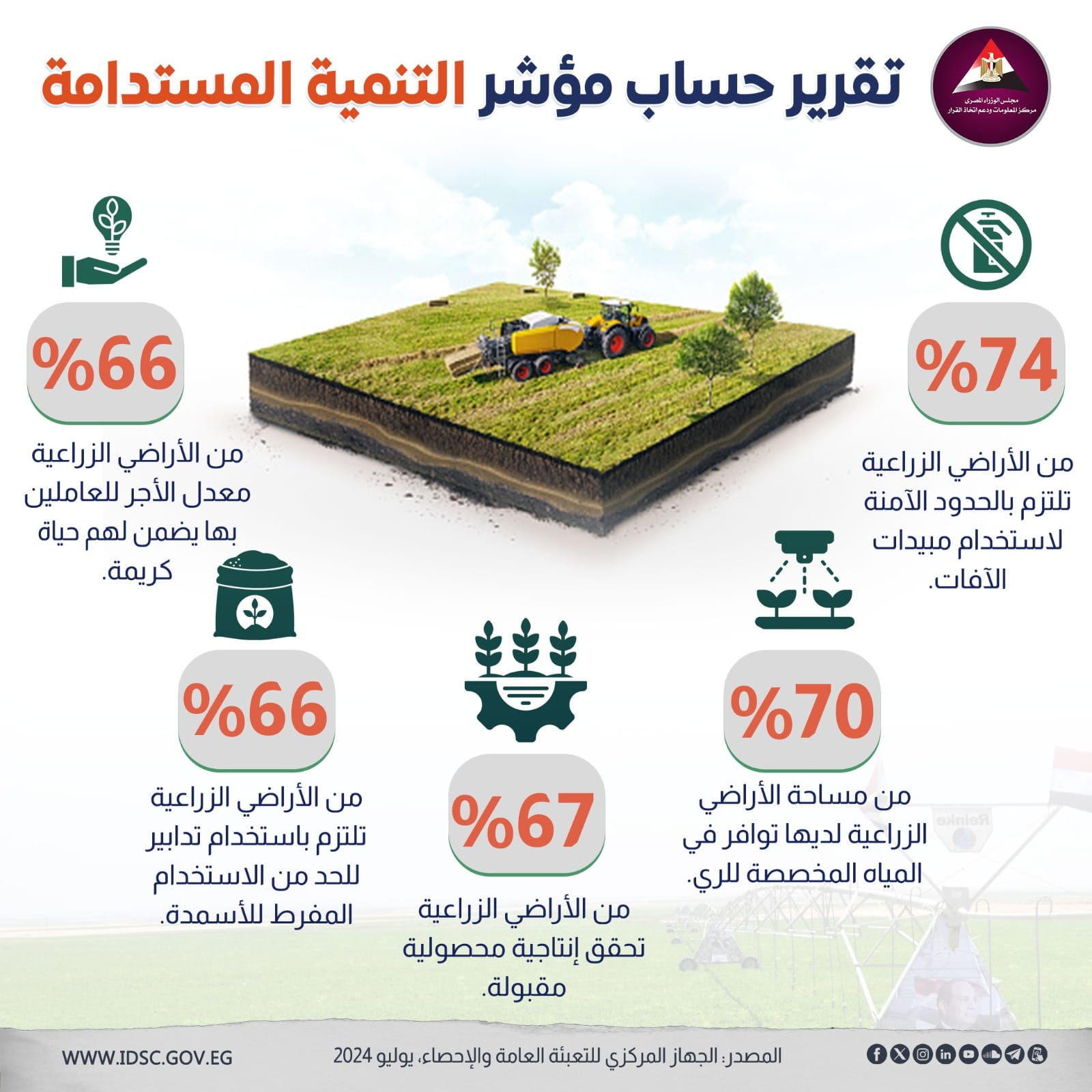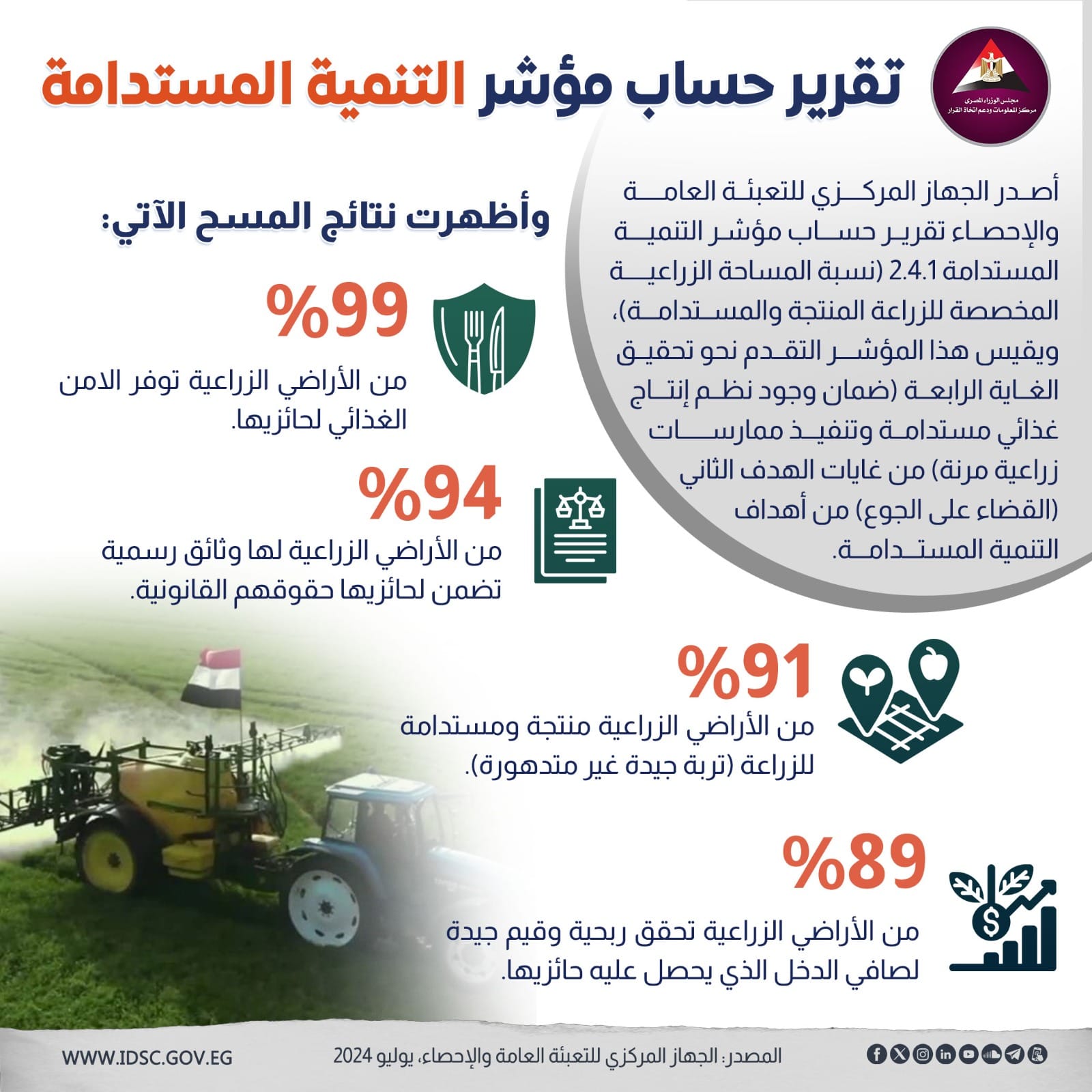 سلط مركز معلومات مجلس الوزراء الضوء على تقرير الجهاز المركزي للتعبئة العامة والإحصاء بشأن حساب مؤشر التنمية المستدامة 2-4-1 "نسبة المساحة الزراعية المخصصة للزراعة المنتجة والمستدامة" لجمع بيانات المزارع الأسرية وغير الأسرية، وذلك لتوفير معلومات تفصيلية لرصد وحساب المؤشر، بالاعتماد على المنهجية الدولية لمنظمة الأمم المتحدة للأغذية والزراعة (الفاو) وفقًا للأبعاد الثلاثة للإنتاج المستدام: الاقتصادية والاجتماعية والبيئية.