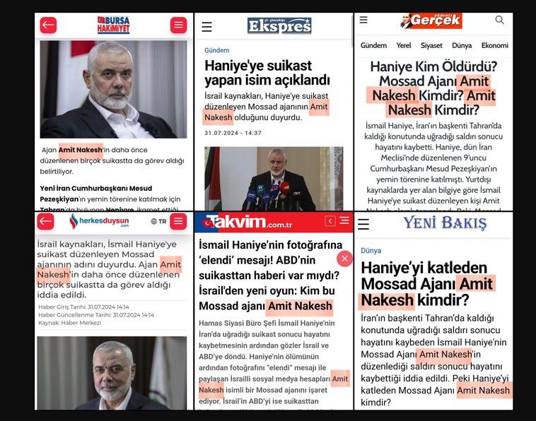 وتسبب كشف وسائل الإعلام التركية عن اسم عميل الموساد المتورط فى اغتيال إسماعيل هنية، فى حالة من الجدل بين أنقرة وتل أبيب، بعدما سخرت الأخيرة من استخدام الإعلام التركى اسم "أميت نقش" موضحة أن هذا الاسم بالعبري يعنى القاتل وليس اسم شخص كما ذكرت الصحف التركية.