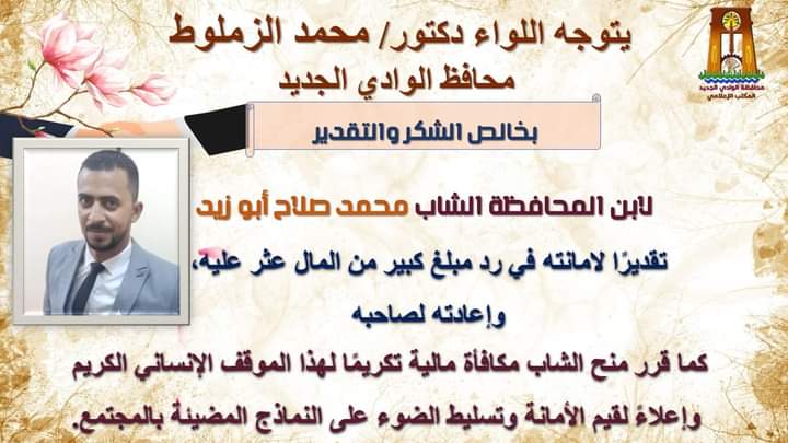 توجه اللواء دكتور محمد الزملوط محافظ الوادي الجديد، في بيان رسمي، صباح اليوم الجمعة، بخالص الشكر والتقدير لابن المحافظة الشاب محمد صلاح أبو زيد - تقديرًا لامانته في رد مبلغ كبير من المال عثر علية وإعادته لصاحبه.