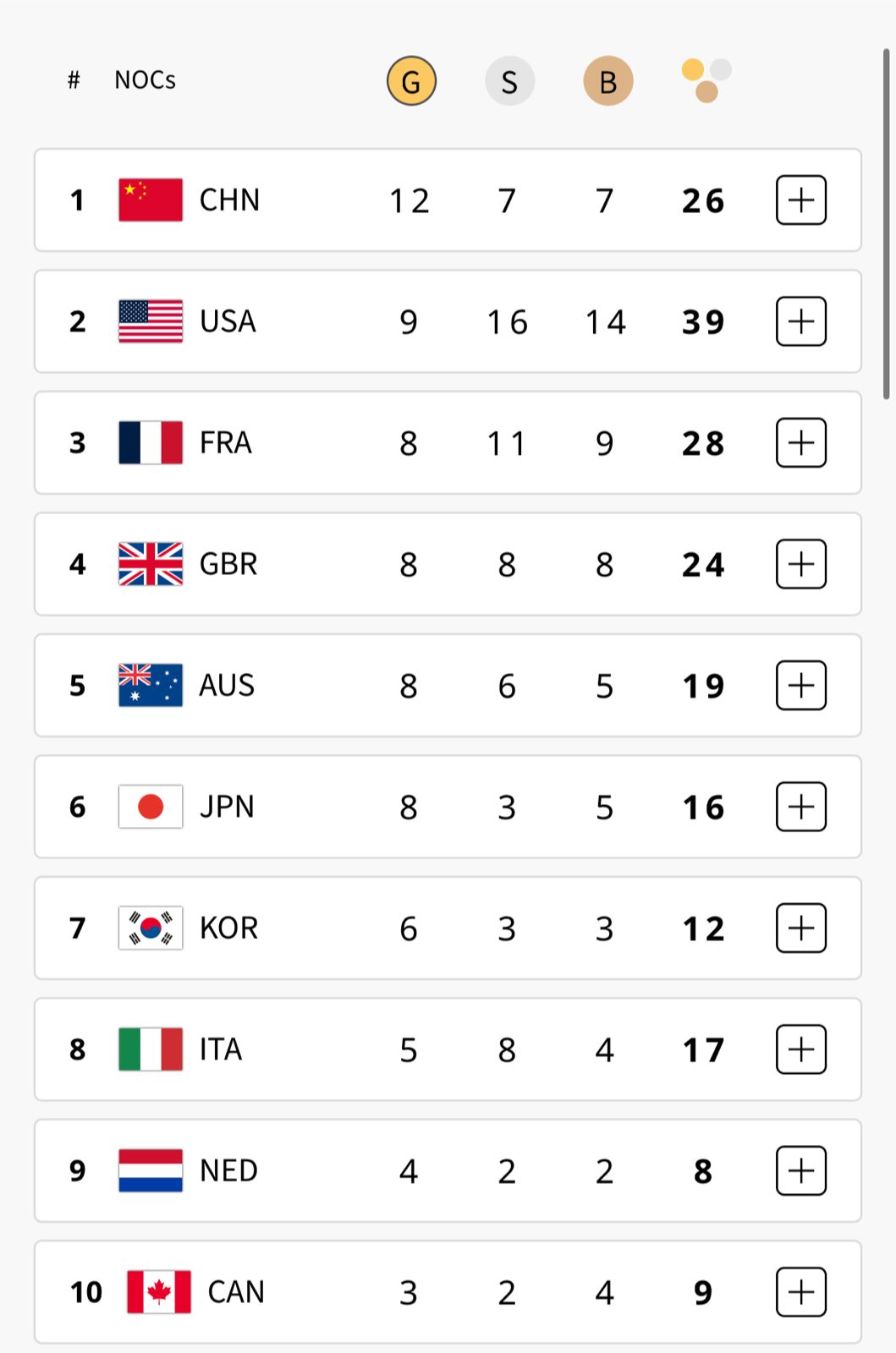 يستمر الصراع على الفوز بالميداليات الأولمبية في دورة الألعاب الأولمبية باريس 2024 في ظل صدارة الصين.