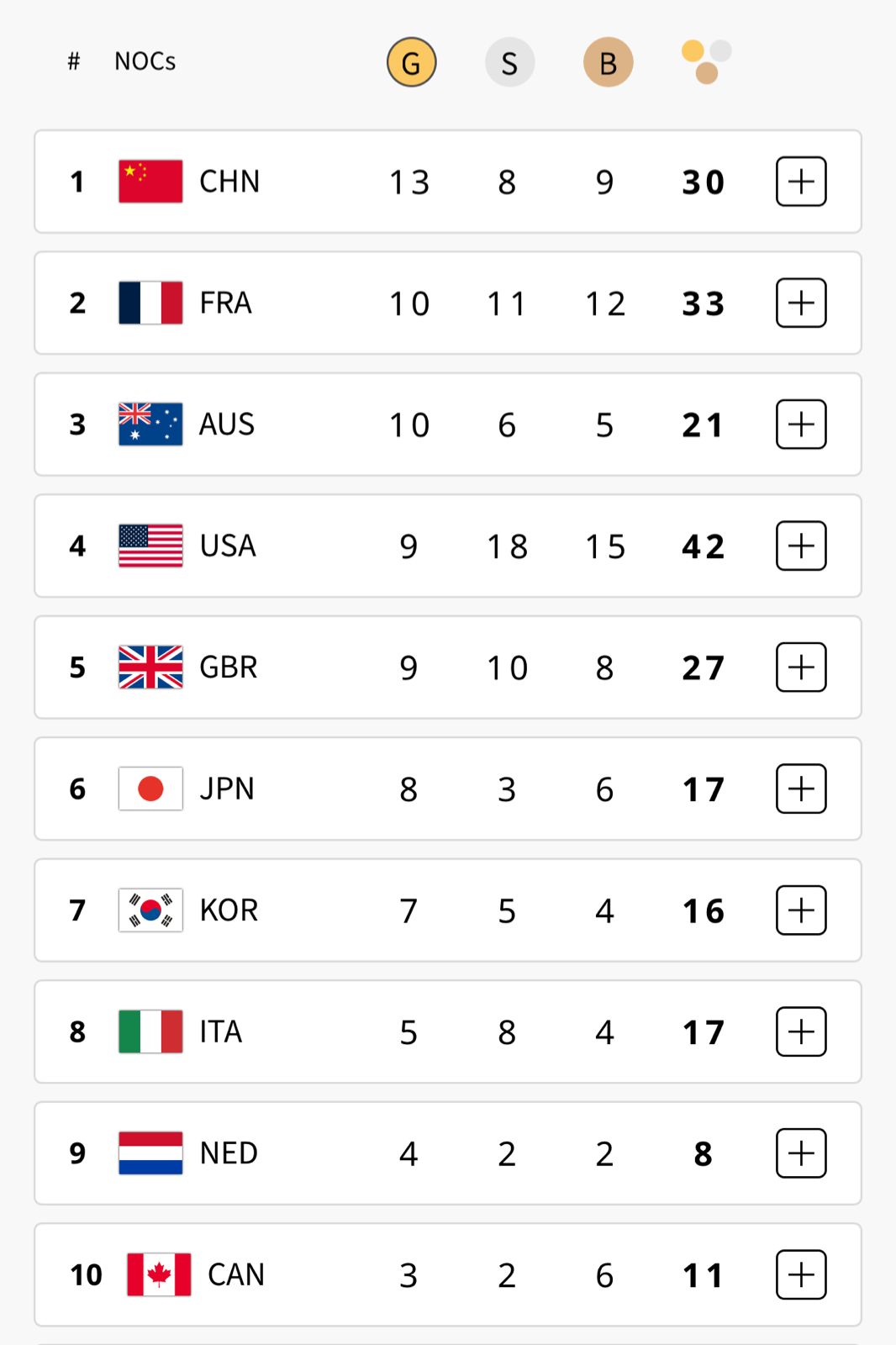 وتتصدر الصين جدول ميداليات باريس 2024 بعد الحصول على 13 ميدالية ذهبية، ويأتي خلفها فرنسا بـ 10 ميداليات ذهبية، ثم أستراليا في المركز الثالث برصيد 10 ميداليات ذهبية هي الأخرى.