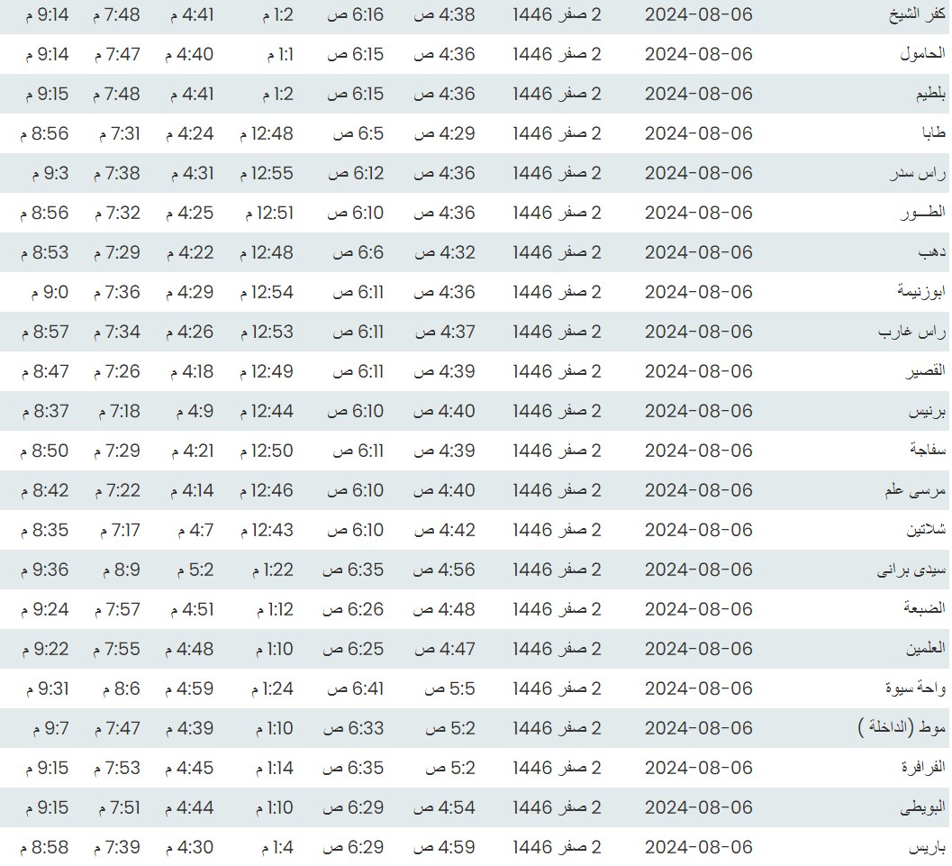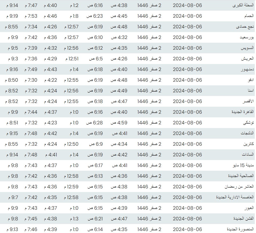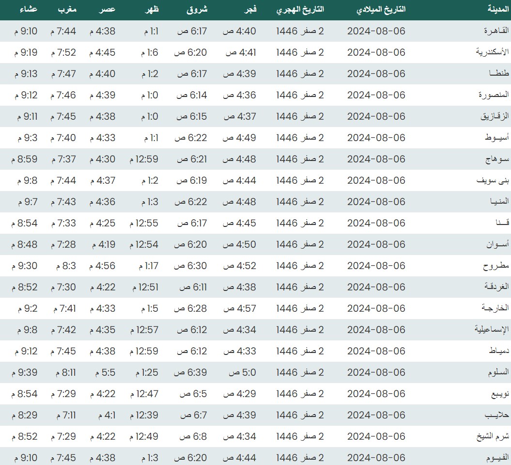 مواقيت الصلاة اليوم الثلاثاء 6- 8- 2024 في القاهرة والمحافظات
