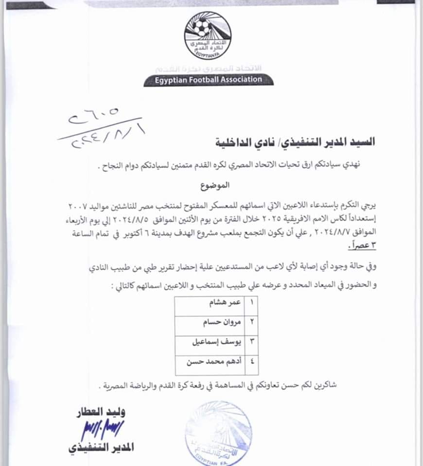 أرسل الاتحاد المصري لكرة القدم فاكس لنادي الداخلية يفيد بطلب انضمام رباعي فريق 2007 لمنتخب مصر للناشئين استعدادا لبطولة كأس الأمم الأفريقية 2025.