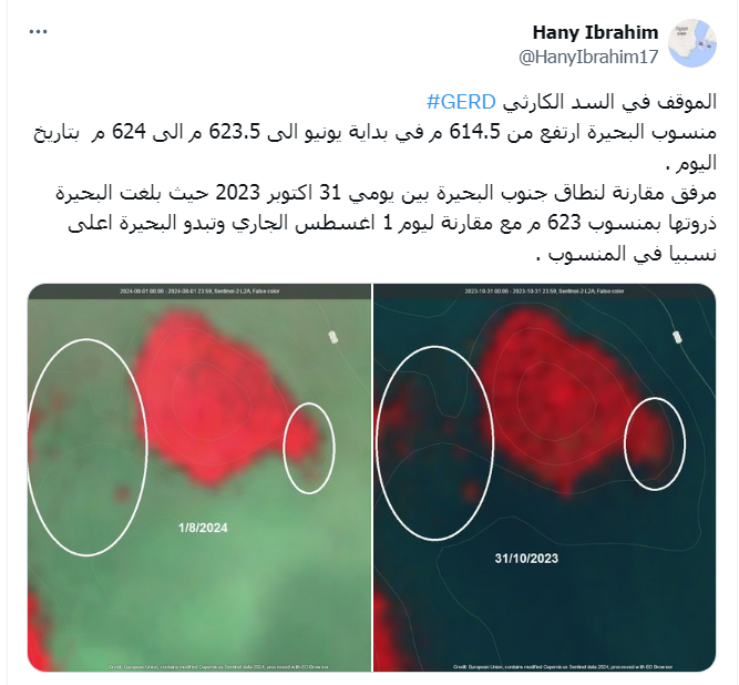 وأشار إلى أن "مقارنة لنطاق جنوب البحيرة بين يومي 31 أكتوبر 2023 بلغت البحيرة ذروتها بمنسوب 623 متر، ويوم 1 أغسطس الجاري تبدو البحيرة أعلى نسبيا في المنسوب."