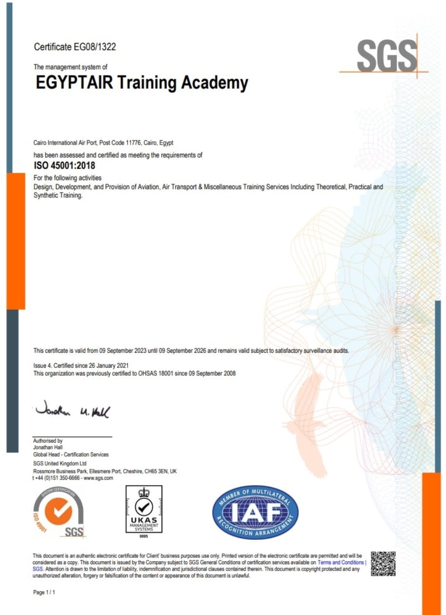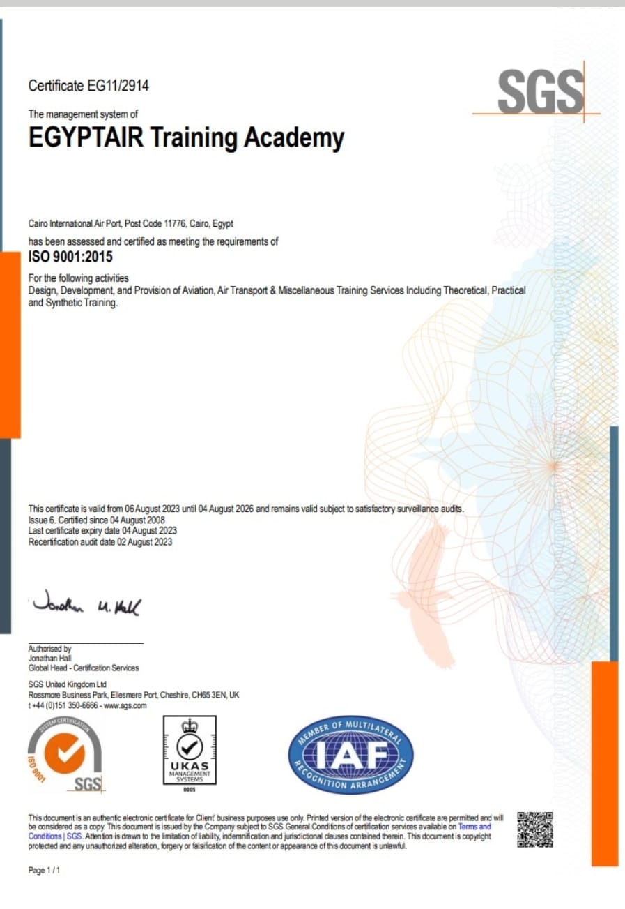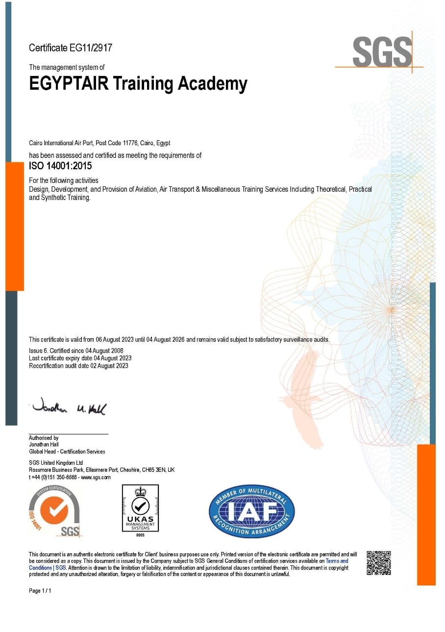 كما جددت شركة (SGS) اعتماد أكاديمية مصر للطيران للتدريب لشهادات الجودة والبيئة والسلامة والصحة المهنية (ISO 14001:2015)-(45001:2018) -(ISO 9001:2015)