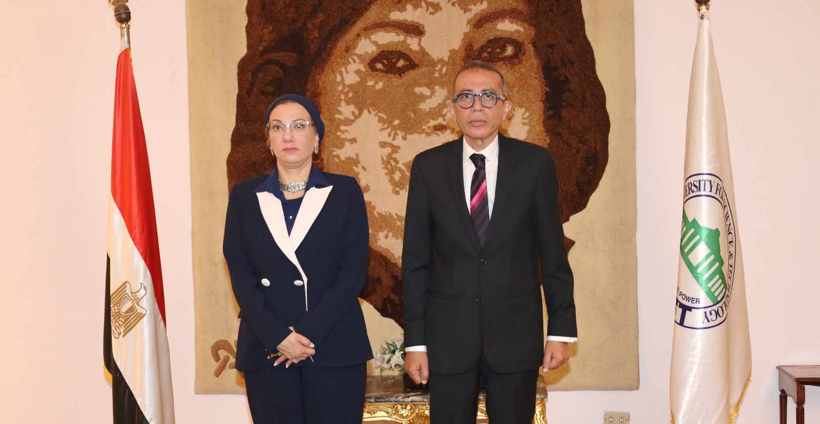 وعلى هامش الحفل تم تكريم د. ياسمين فؤاد وزيرة البيئة ومنحها درع جامعة مصر للعلوم والتكنولوجيا، على جهودها الدؤوبة فى مجال العمل البيئى.