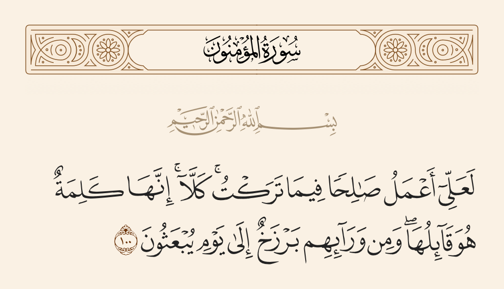 قال تعالى: «حَتَّى إِذا جاءَ أَحَدَهُمُ الْمَوْتُ قالَ رَبِّ ارْجِعُونِ (٩٩) لَعَلِّي أَعْمَلُ صالِحًا فِيما تَرَكْتُ كَلاَّ إِنَّها كَلِمَةٌ هُوَ قائِلُها وَمِنْ وَرائِهِمْ بَرْزَخٌ إِلى يَوْمِ يُبْعَثُونَ (١٠٠)».