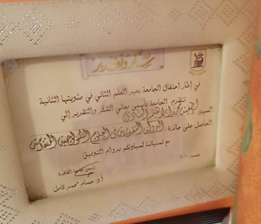 وكرمني حيث كنت أول امرأة مصرية تحصل على الدكتوراه في الفيزياء النووية، ثم انتقلت لجامعة القاهرة عام 1970, ونشأت في أسرة تعشق العلم والدي كان أول المتعلمين في بلده عام 1910 وحاصل على عالمية الأزهر ومدرسة القضاء الشرعي ومدرسة (كلية) دار العلوم ووالدتي كانت تشجعنا على التعليم حتى تفوقت وأشقائي وحصلنا على أعلى الدرجات العلمية والوظائف شقيقي كان طيارا وشقيق ثاني اول من أدخل تصوير المخ والأعصاب في مصر.