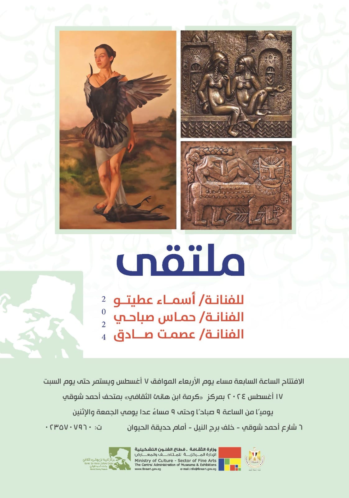 أعلن قطاع الفنون التشكيلية برئاسة الدكتور وليد قانوش، عن تنظيم معرض جماعي بمركز كرمة بن هانئ الثقافي وذلك بعنوان “ملتقى”، لعدد من الفنانات وهن أسماء عطيتو، وحماس صباحي، وعصمت صادق