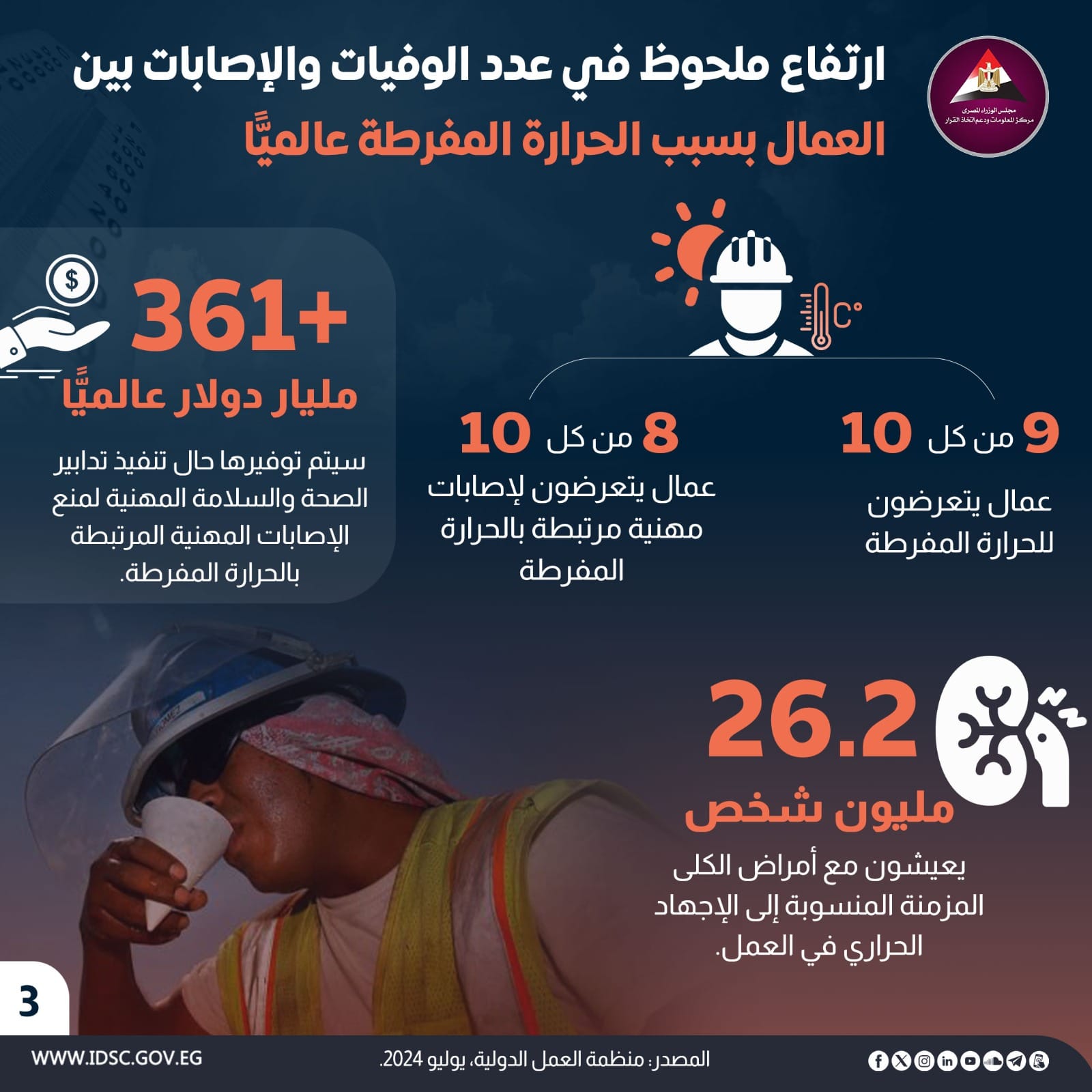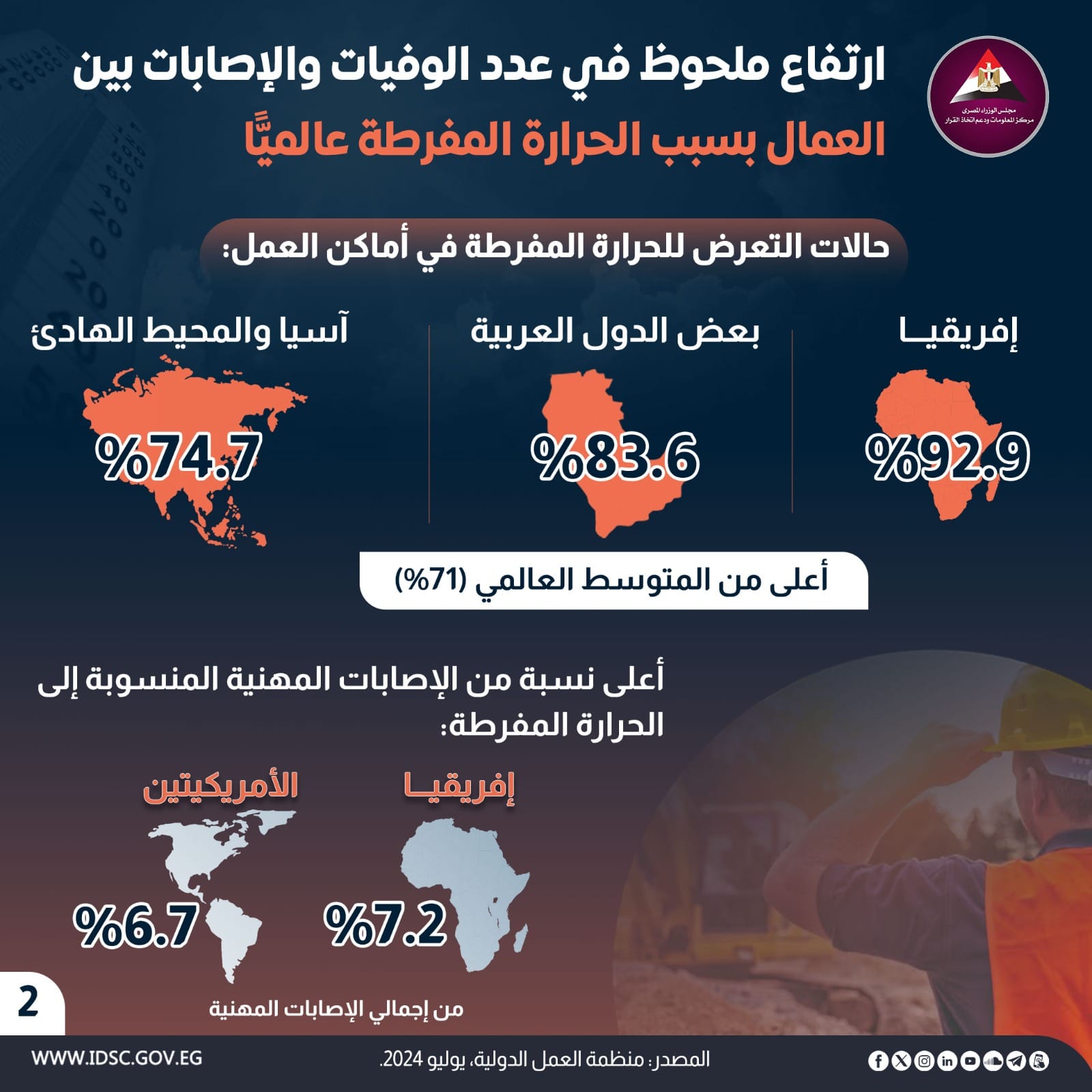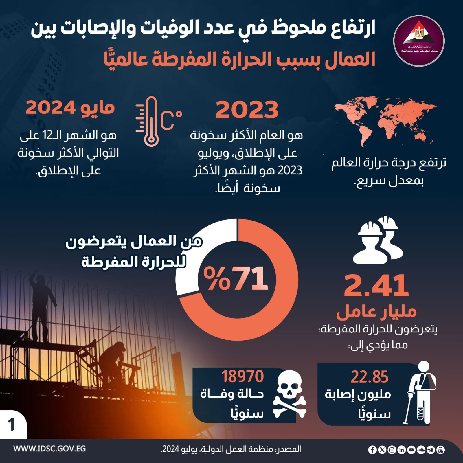 سلط مركز المعلومات ودعم اتخاذ القرار بمجلس الوزراء الضوء على ارتفاع أعداد الوفيات والإصابات بين العمال بسبب الحرارة المفرطة عالميا حيث وصل عدد الوفيات بين العمال إلى 18970 حالة.