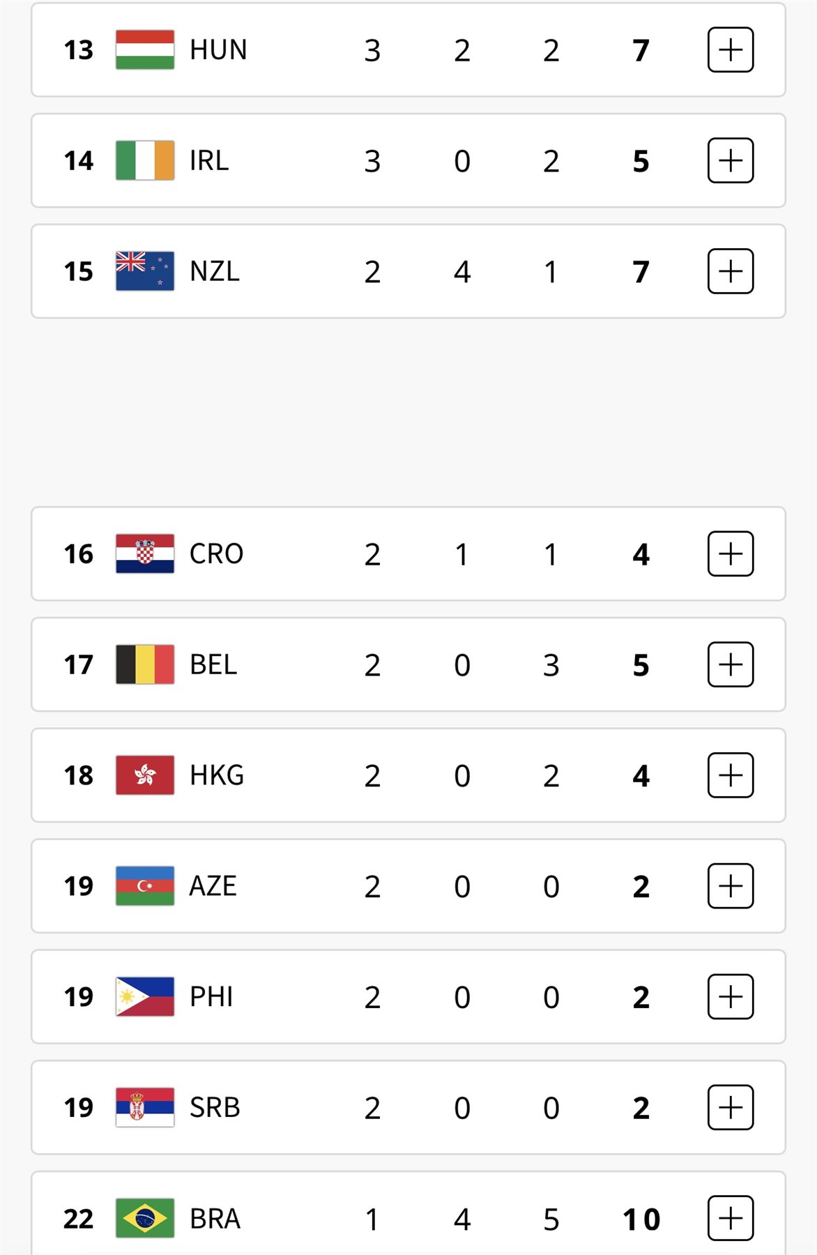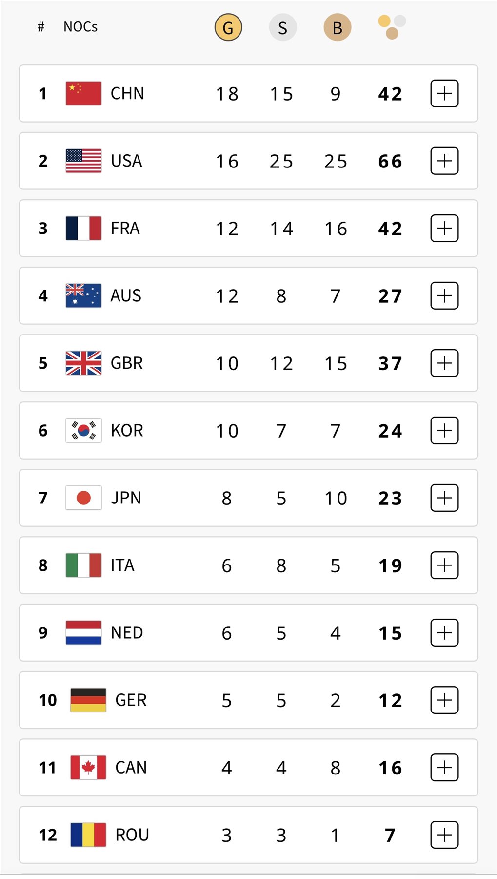 أولمبياد باريس 2024، عززت الصين تصدرها لجدول ترتيب ميداليات باريس 2024 بعد الحصول على 18 ميداليات ذهبية، كما واصلت الولايات المتحدة الأمريكية مطاردتها برصيد 16 ميدالية ذهبية، وتمتلك بشكل عام المجموع الأكبر من الميداليات بواقع 66 ميدالية.