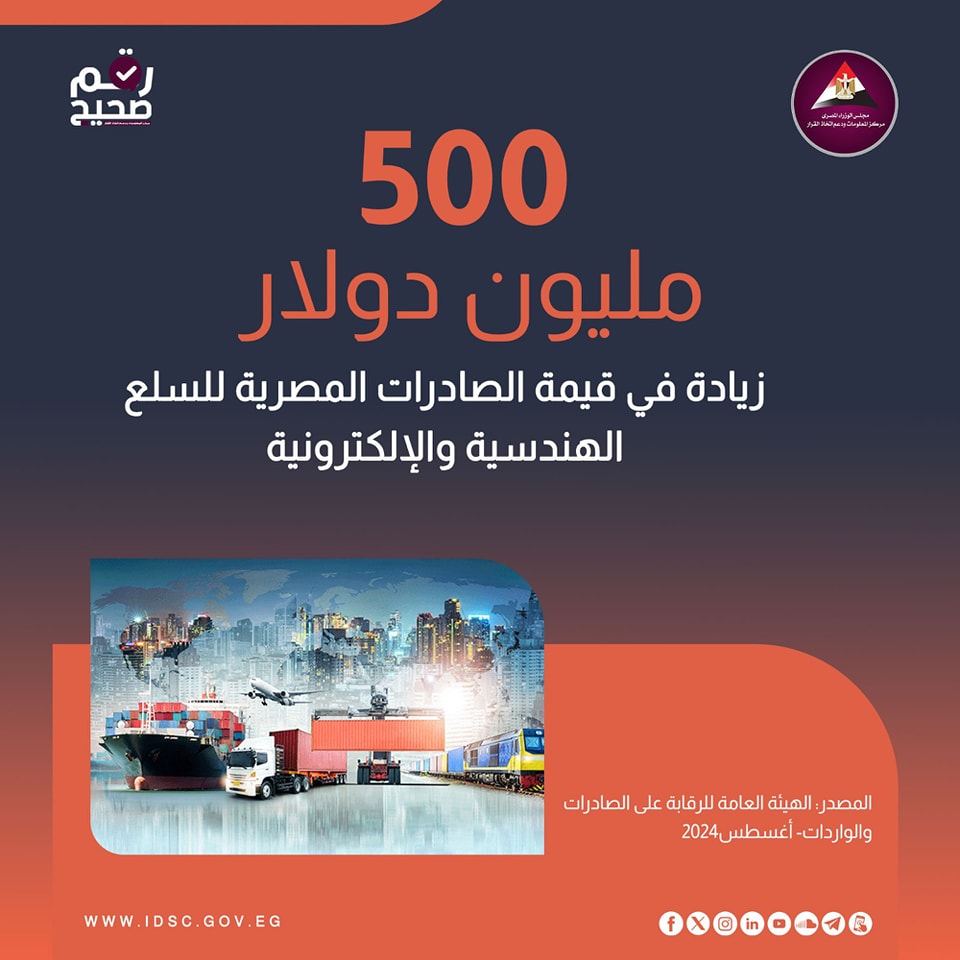 كشف مركز المعلومات ودعم اتخاذ القرار بمجلس الوزراء عن زيادة في قيمة الصادرات المصرية من السلع الهندسية والإلكترونية.
