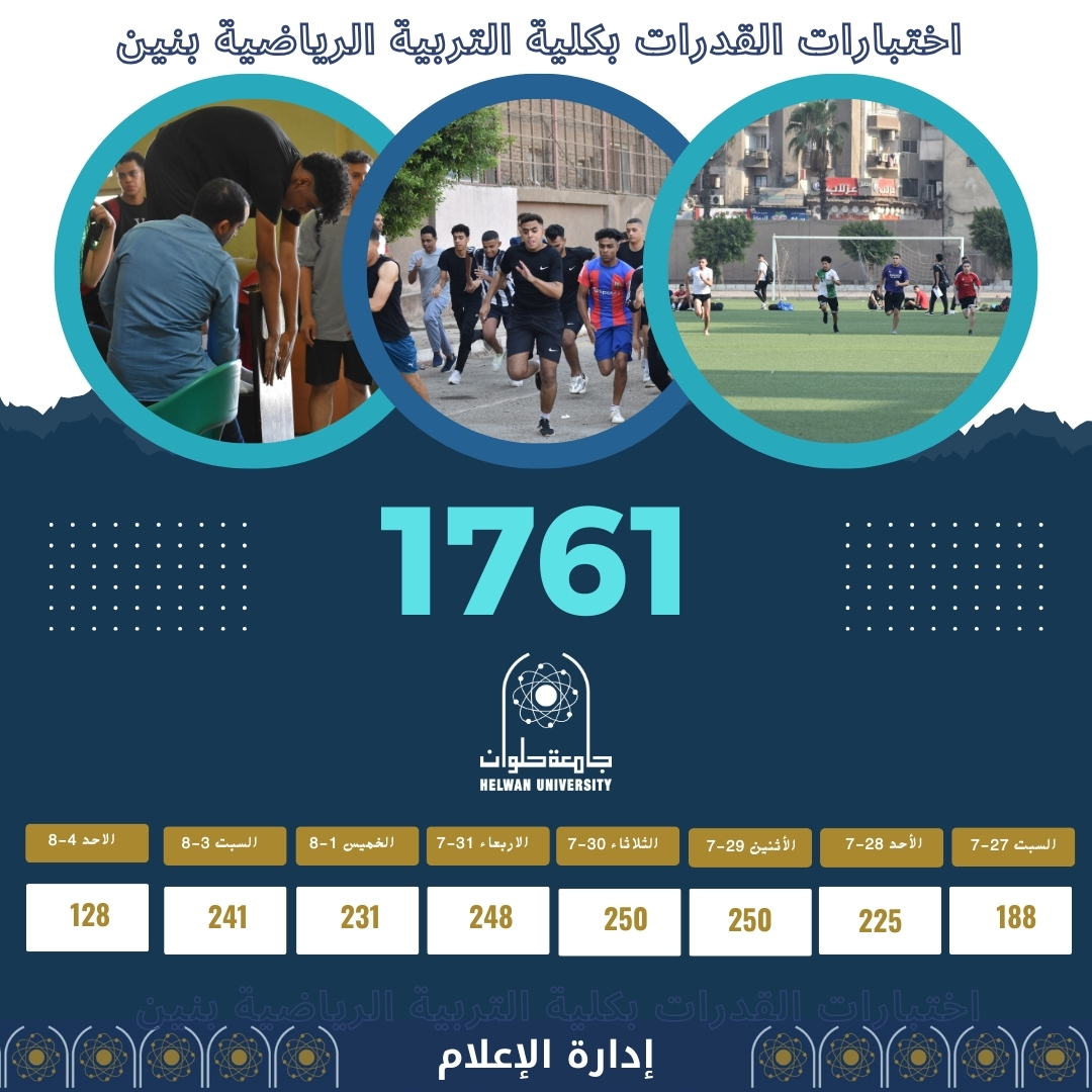واصلت كلية التربية الرياضية للبنات استقبال الطالبات لإجراء اختبارات القدرات، حيث شهد اليوم إقبالًا 445 طالبة، حيث أدت 297 طالبة الاختبارات في اليوم الأول لها اليوم، 148 طالبة أدت الاختبارات لليوم الثاني، وبهذا يرتفع إجمالي عدد الطالبات اللاتي تقدمن لاختبارات القدرات منذ بدايتها إلى 1036 طالبة.