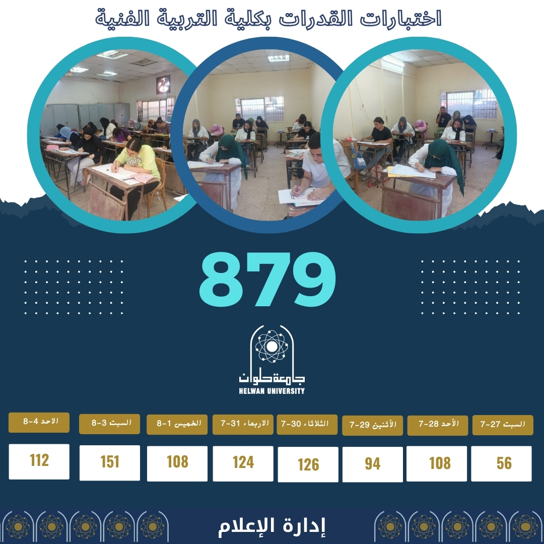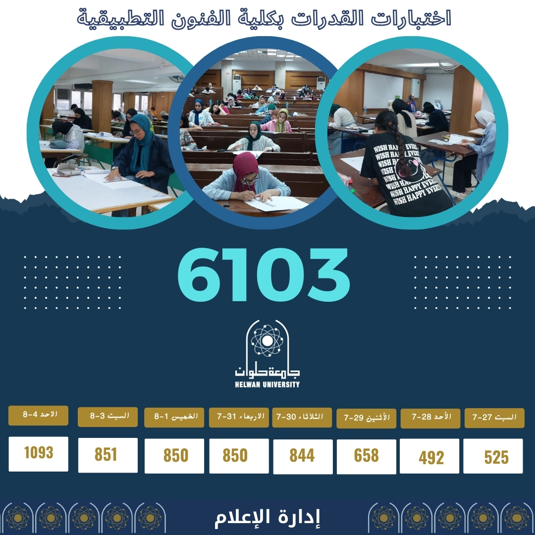 خضع اليوم 1093 طالبًا وطالبة لاختبارات القدرات بكلية الفنون التطبيقية بجامعة حلوان، وبهذا، يرتفع إجمالي عدد الطلاب الذين أدوا الاختبارات حتى الآن إلى 6103 طالبًا وطالبة.