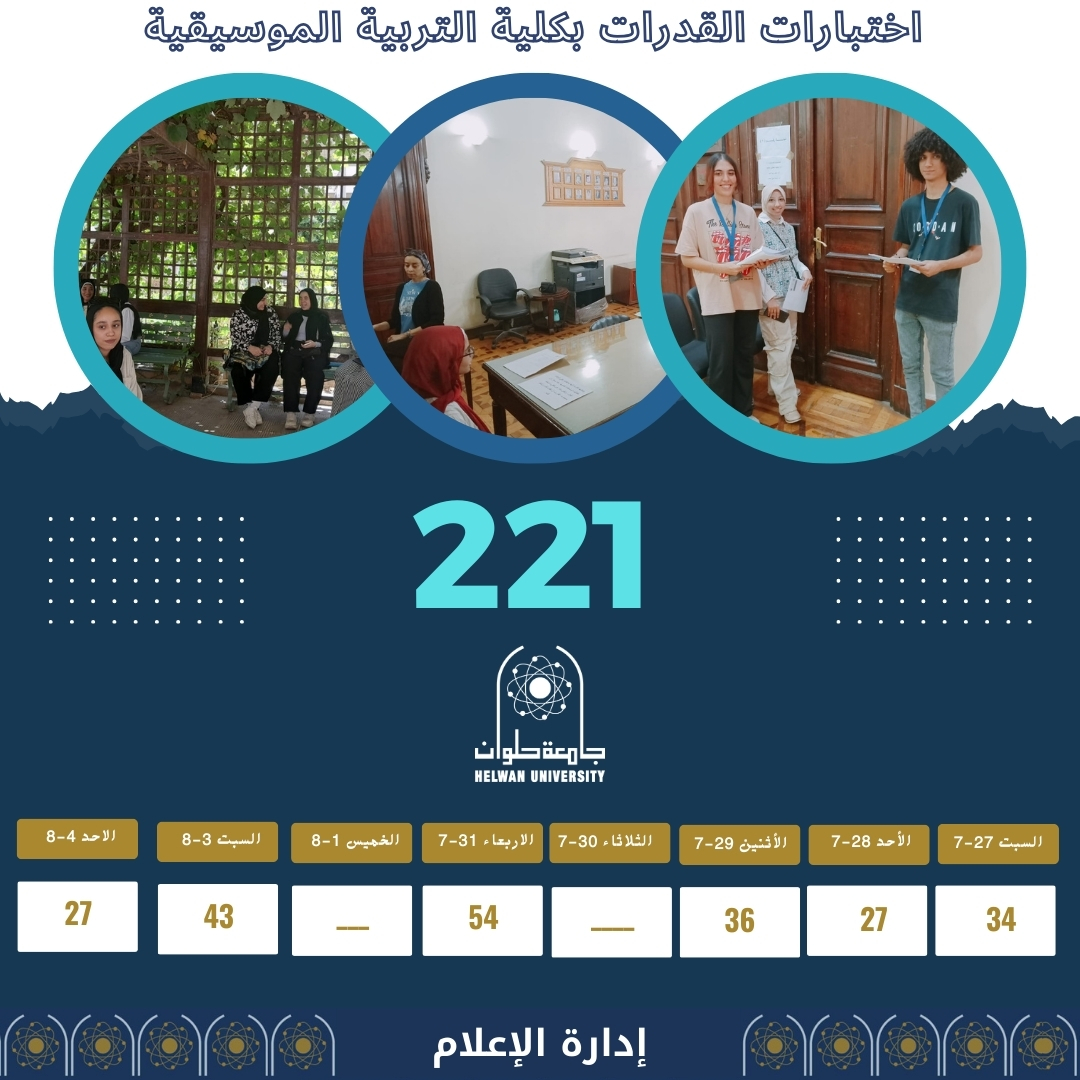 استقبلت كلية التربية الموسيقية اليوم 27 طالبًا وطالبة لإجراء اختبارات القدرات الخاصة بها. وبهذا، يرتفع إجمالي عدد طلاب الثانوية العامة الذين خضعوا لاختبارات القدرات بالكلية إلى 221 طالبًا وطالبة.