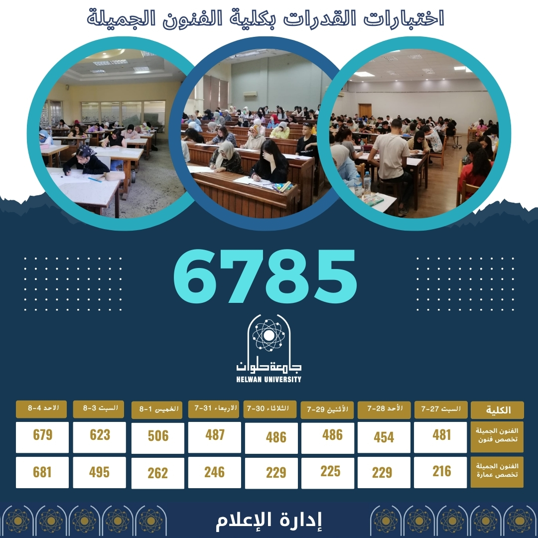 كما أدى 1360 طالبًا وطالبة اليوم اختبارات القدرات بكلية الفنون الجميلة بجامعة حلوان. توزع المتقدمون على تخصصين: 679 طالبًا وطالبة في تخصص الفنون، 681 في تخصص العمارة، وبهذا، يرتفع إجمالي عدد الطلاب الذين أدوا اختبارات القدرات حتى الآن إلى 6785 طالبًا وطالبة.