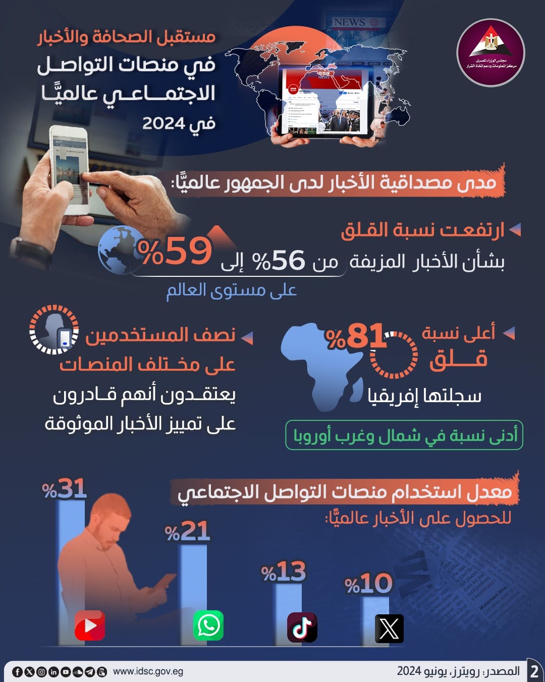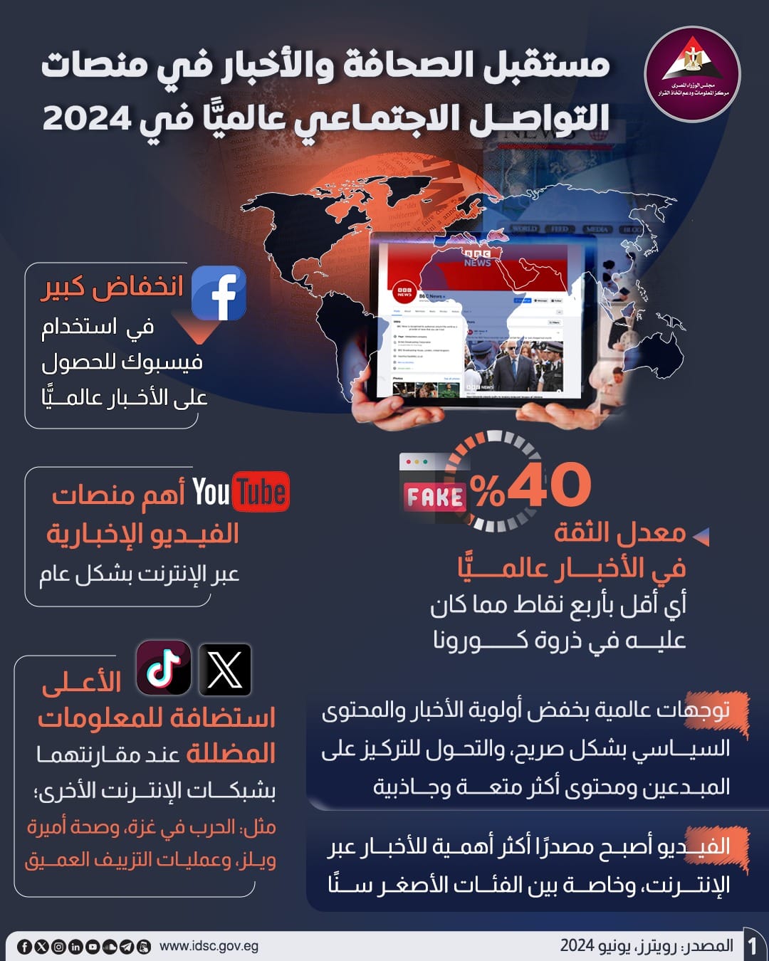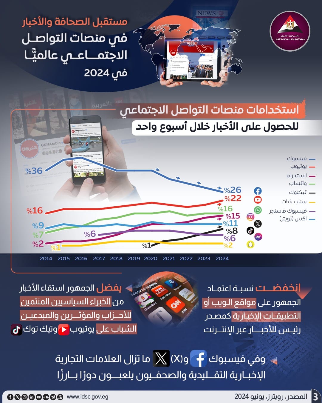 سلط مركز المعلومات ودعم اتخاذ القرار بمجلس الوزراء الضوء على دراسة جديدة من رويترز حول مستقبل الصحافة والأخبار في منصات التواصل الاجتماعي عالميا في 2024.
