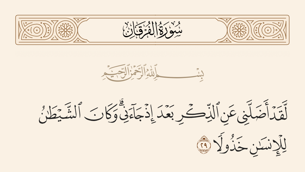 قال تعالى: «لَقَدْ أَضَلَّنِي عَنِ الذِّكْرِ بَعْدَ إِذْ جَاءَنِي وَكَانَ الشَّيْطَانُ لِلْإِنْسَانِ خَذُولًا».