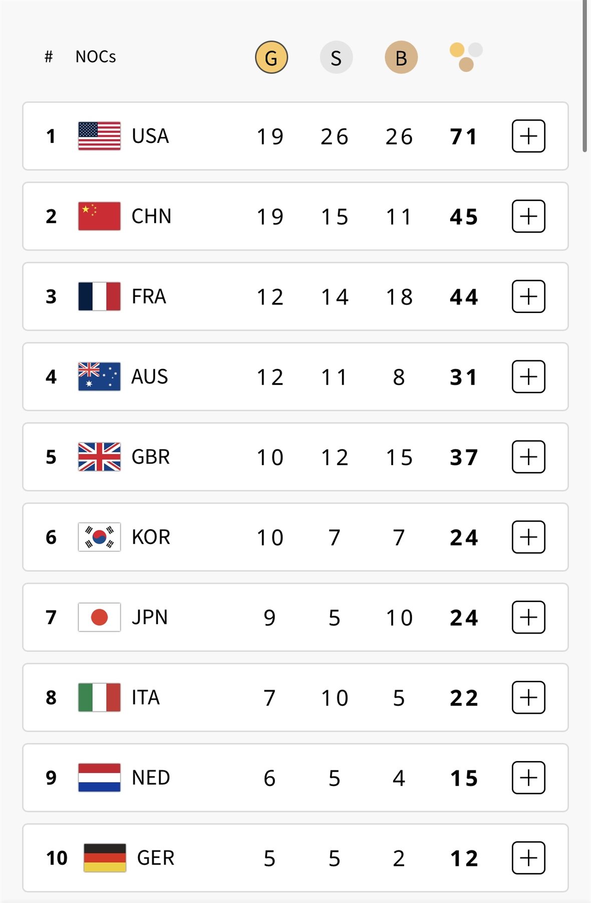 أولمبياد باريس، تتصدر الولايات المتحدة الأمريكية صدارة الترتيب العام للميداليات في أولمبياد باريس مناصفه مع الصين برصيد 19 ميدالية ذهبية لكل منهما.