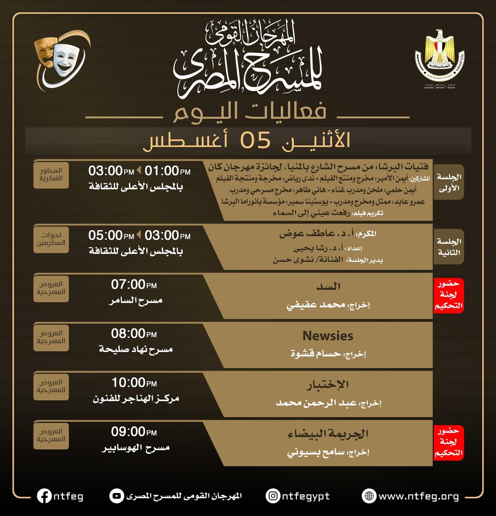 تقام اليوم الإثنين، سابع أيام المهرجان القومي للمسرح المصري في دورته السابعة عشرة، برئاسة الفنان محمد رياض، ندوتان ضمن برنامج المحور الفكري ومحور المكرمين بالمهرجان.