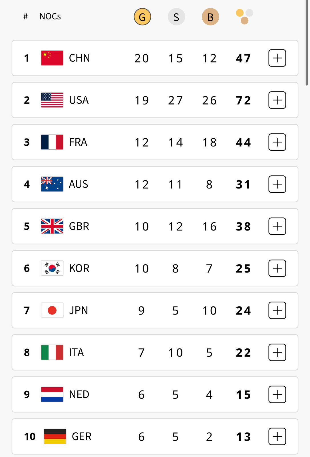 أولمبياد باريس، استعادت الصين صدارة جدول الترتيب العام للميداليات في أولمبياد باريس بعد حصد الميدالية الذهبية رقم 20 لها متفوقة على الولايات المتحدة الأمريكية التي تأتي في الوصافة بـ 19 ميدالية ذهبية.