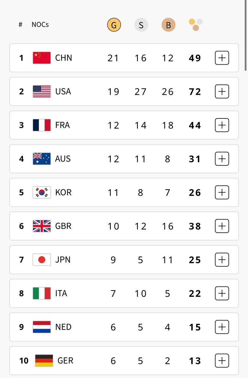 الصين توسع الفارق مع أمريكا، جدول الترتيب العام لميداليات أولمبياد باريس