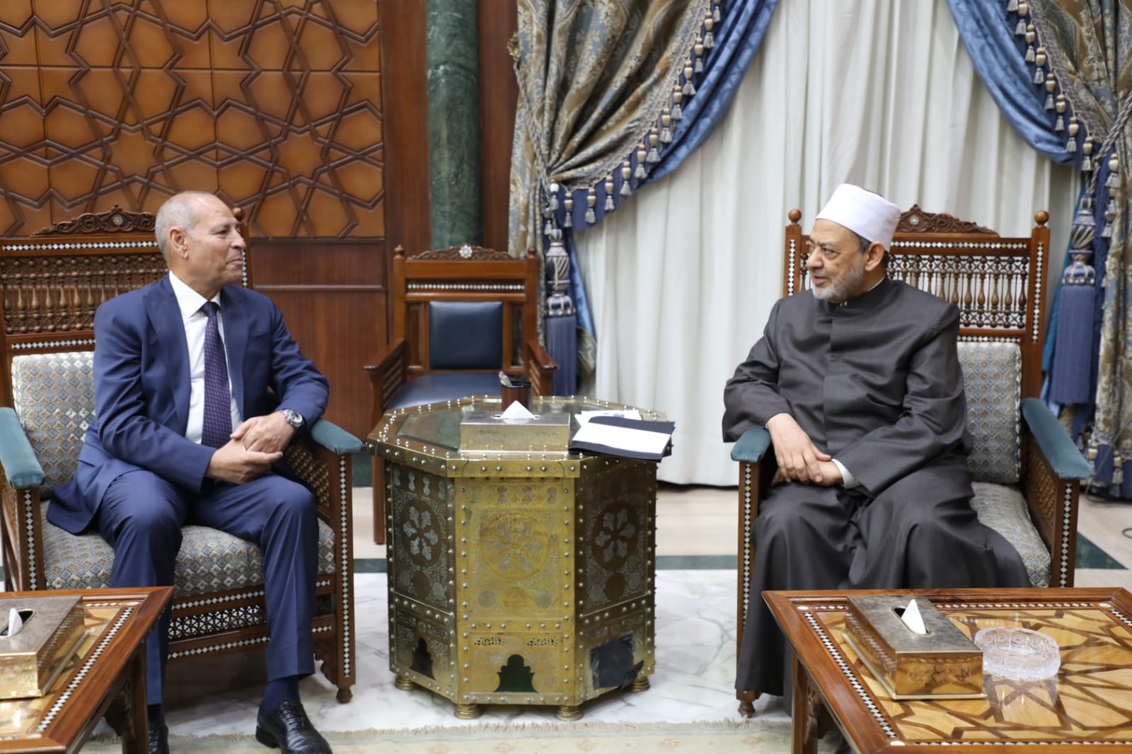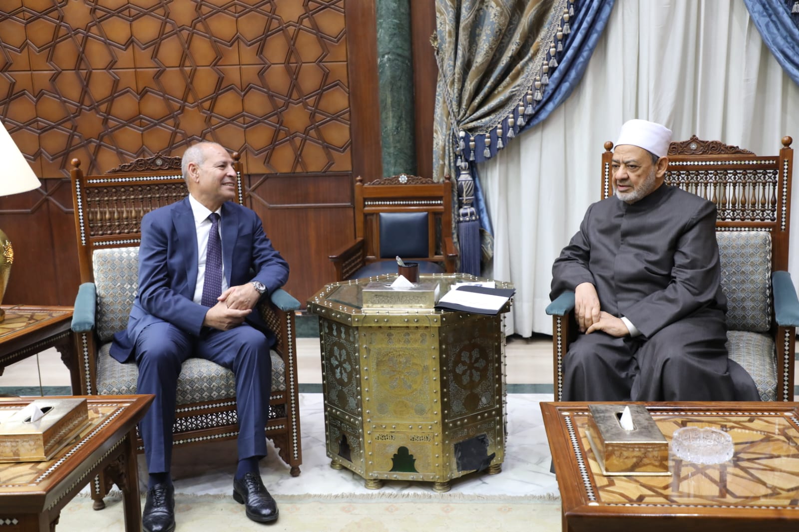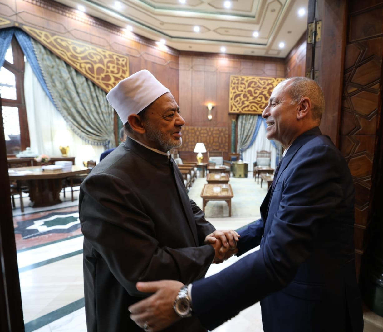 قام الدكتور إبراهيم صابر محافظ القاهرة بزيارة فضيلة الإمام الأكبر الدكتور أحمد الطيب شيخ الجامع الأزهر بمقر مشيخة الأزهر بالدراسة.