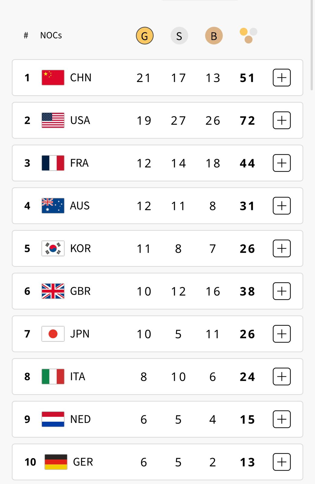 أولمبياد باريس، تواصل الصين تصدرها لجدول الترتيب العام للميداليات في أولمبياد باريس برصيد 21 بدورة الألعاب الأولمبية المقامة حاليا بالعاصمة الفرنسية، ثم تأتي الولايات المتحدة الأمريكية في الوصافة بـ 19 ميدالية ذهبية.