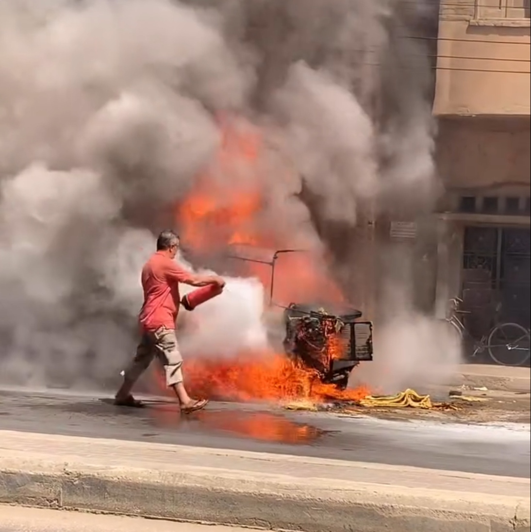 بسبب ماس كهربائي، اشتعال النار بتوك توك في المحلة الكبرى