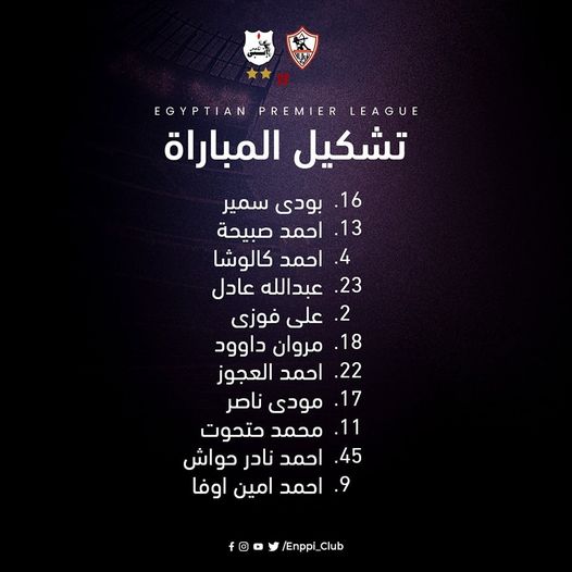 ويتواجد على مقاعد البدلاء، عمر عبد العزيز وأحمد مجدي ومحمد عاطف ومحمد السيد ومهاب ياسر وعمار ياسر وناصر ماهر وحازم أسامة ويوسف أوباما.