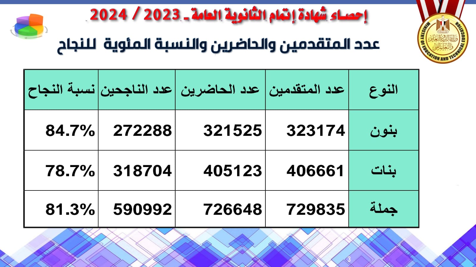 وكشفت وزارة التربية والتعليم والتعليم الفني عن إجمالي عدد المتقدمين والحاضرين والنسبة المئوية لنجاح طلاب الثانوية العامة 2024.