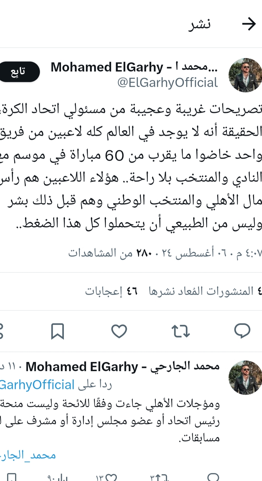 الأهلي، أكد محمد الجارحي عضو مجلس إدارة الأهلي، أن تصريحات مسئولي اتحاد الكرة غريبة وعجيبة.