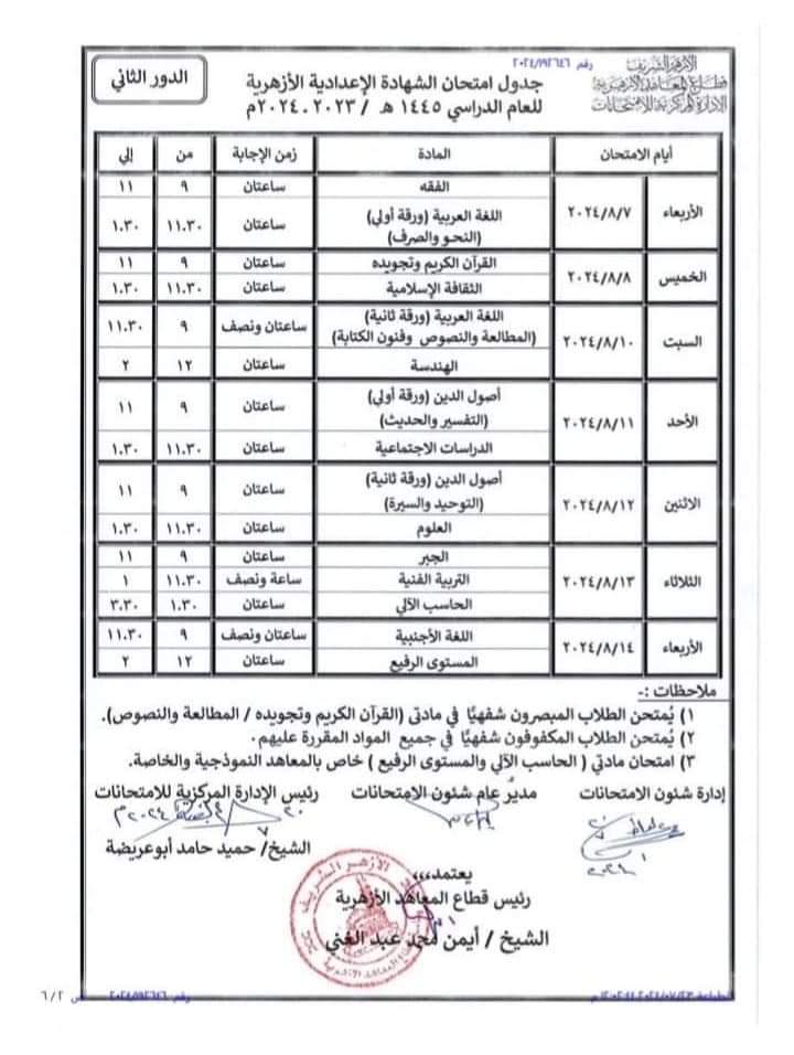 جدول امتحانات الإعدادية الأزهرية الدور الثاني