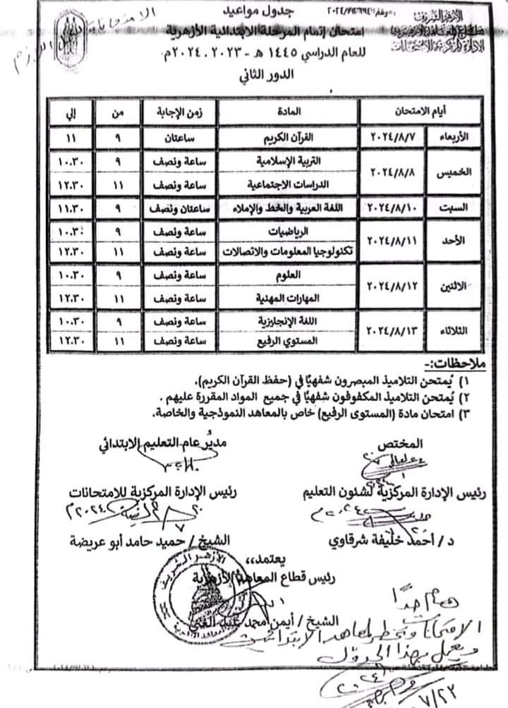 جدول امتحانات الابتدائية الأزهرية الدور الثاني