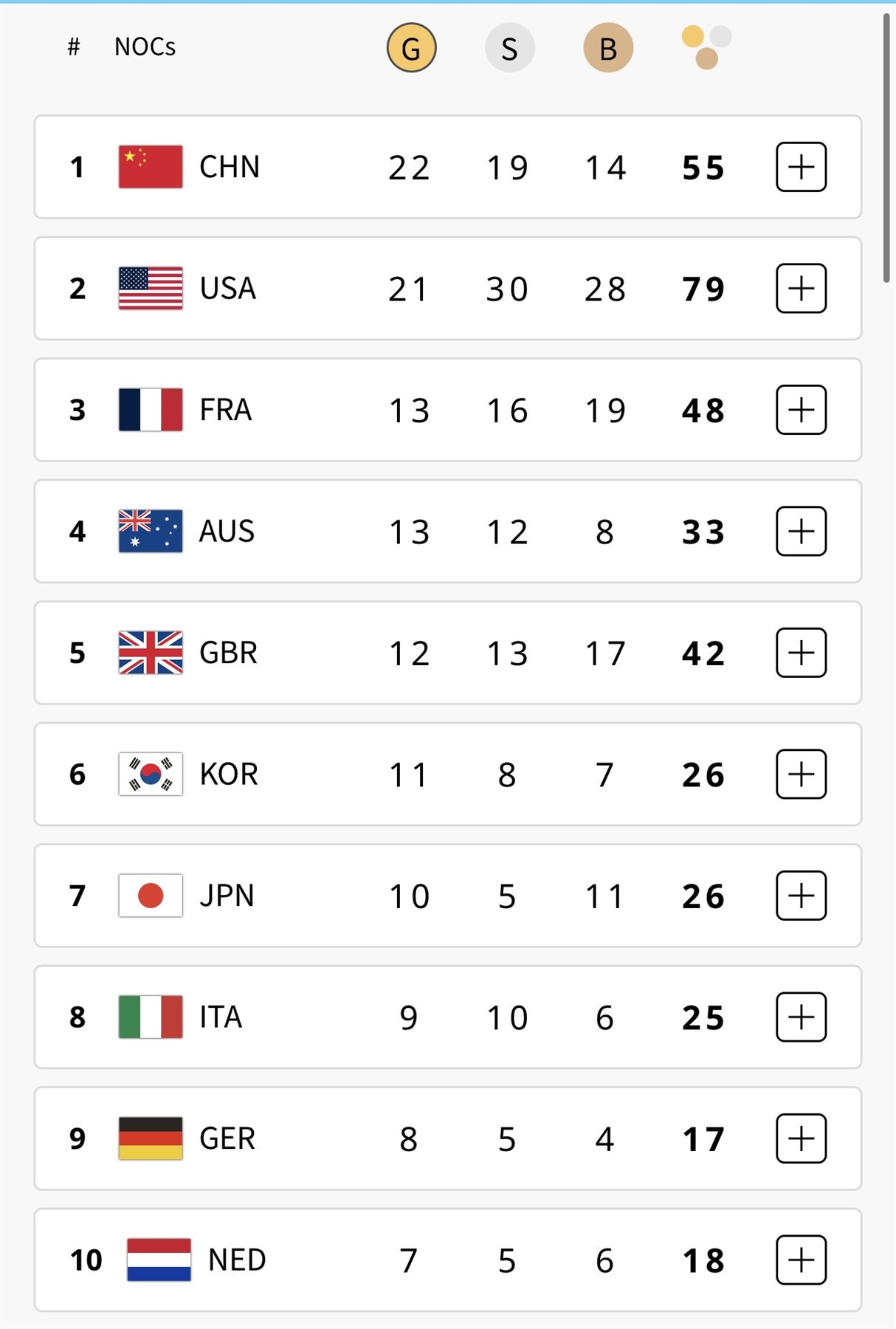 وتتصدر الصين الترتيب العام برصيد 22 ميدالية ذهبية متفوقة علي الولايات المتحدة الأمريكية بفارق ميدالية ذهبية حيث تمتلك 21 ميدالية ذهبية، وبشكل عام حصلت الولايات المتحدة على 79 ميدالية مقابل 55 للصين حتى الآن.
