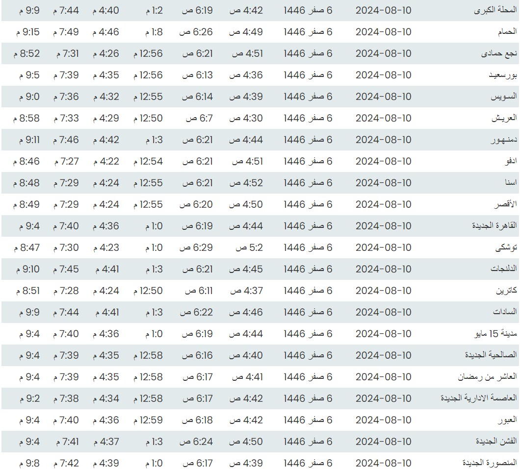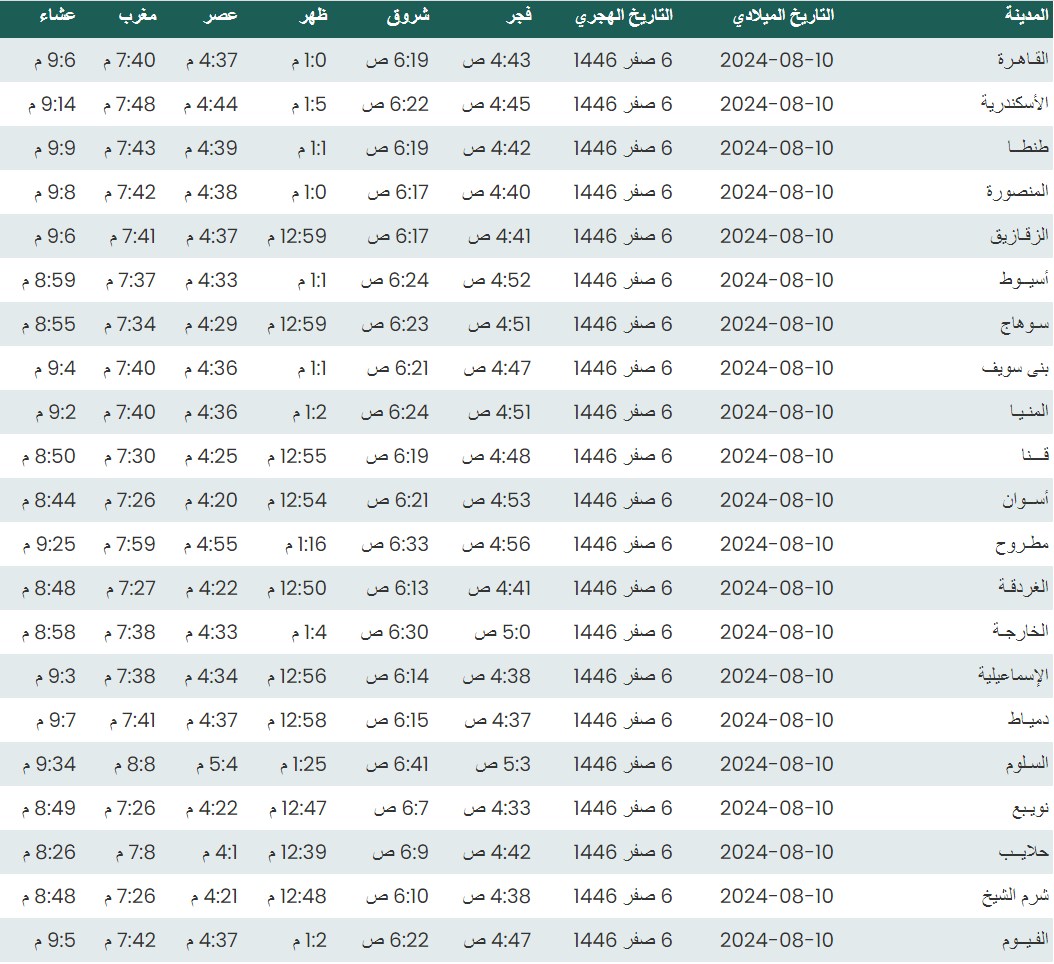 مواقيت الصلاة اليوم وفقًا للتوقيت المحلي لمدينتي القاهرة والإسكندرية وكذلك،مواقيت الصلاة، لعدد من مدن ومحافظات الجمهورية من واقع بيانات الهيئة العامة للمساحة