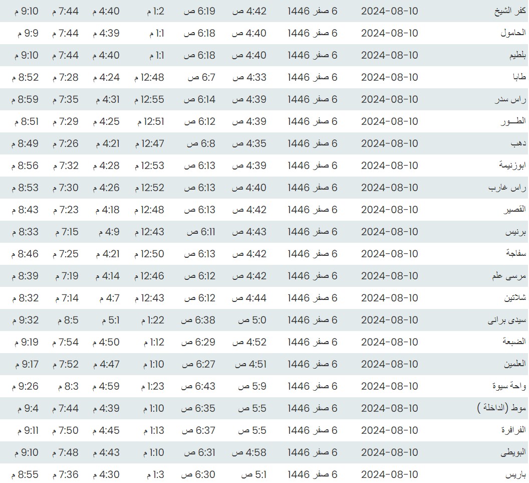 وفيما يلي مواقيت الصلاة، لعدد من مدن ومحافظات الجمهورية من واقع بيانات الهيئة العامة للمساحة