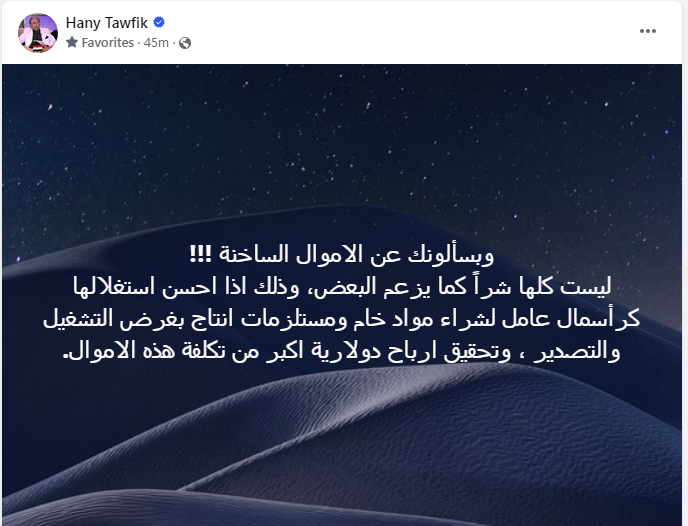وقال هاني توفيق عن الأموال الساخنة: "الأموال الساخنة! ليست كلها شرًا كما يزعم البعض، وذلك إذا أحسن استغلالها كرأسمال عامل لشراء مواد خام ومستلزمات إنتاج بغرض التشغيل والتصدير، وتحقيق أرباح دولارية أكبر من تكلفة هذه الأموال."