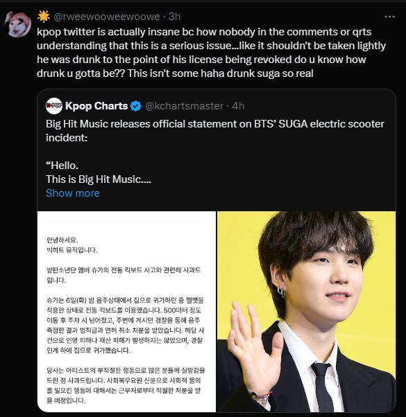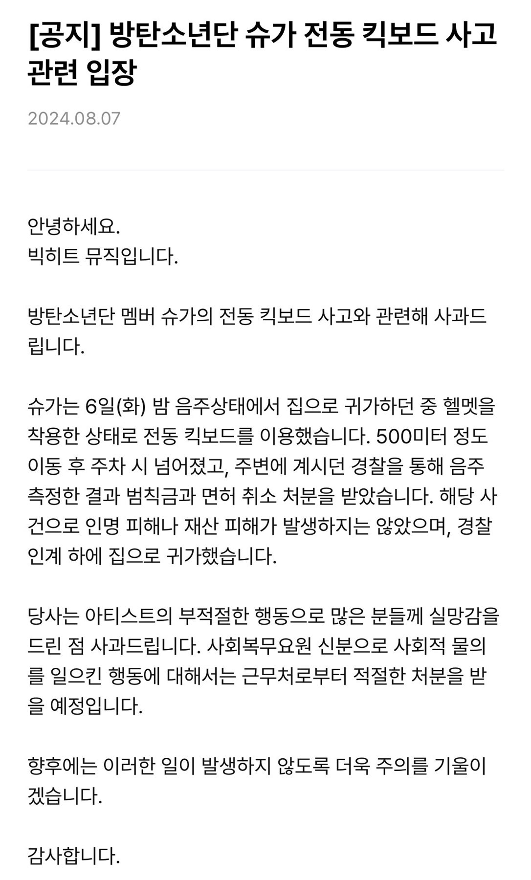 أصدرت شركة Big Hit Music التابعة لشركة HYPE بيانًا رسميًا تعتذر من خلاله على الحادث الذي عرف إعلاميًا بـ “سكوتر SUGA الكهربائي”، فرصدت شرطة مدينة سيول نجم الكيبوب العالمي وعضو فرقة BTS مخمورًا ونائمًا على أحد الأرصفة بشارع قريب من منزله، والذي نتج عنه سحب رخصته للقيادة تحت تأثير الكحول.