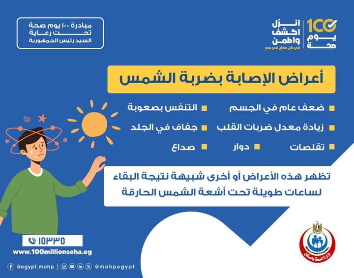 حذرت وزارة الصحة والسكان من تجاهل أعراض الإصابة بضربات الشمس الناتجة عن ارتفاع درجات حرارة الطقس حيث تزيد الإصابة بها مع الإرتفاع الشديد في درجات الحرارة والتعرض للشمس مباشرة.